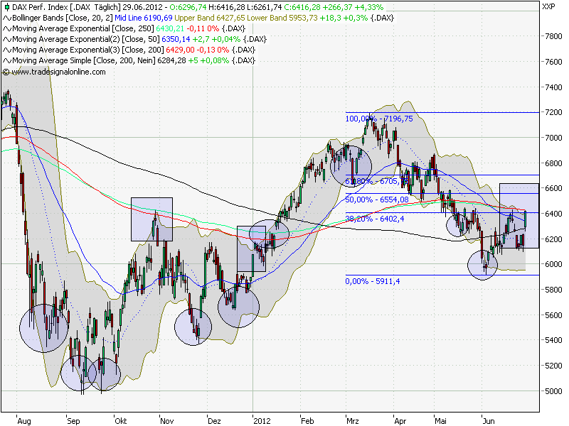Irgendwie erinnert mich die Situation an vorletzte Woche. Da hatte ich mich auch viel zu früh mit Shorts eingedeckt (6300) und der Dax stieg dann bis 6427. Die beiden Handelstage danach waren eine Nervenprobe, da der Dax kaum fiel und es auch nicht so aussah, als wenn er das noch tun würde. Und als ich mit marginalen Gewinn verkauft hatte, fiel er wieder auf 6098. Montag werden wir sicherlich erstmal noch die 6450 oder mehr sehen...