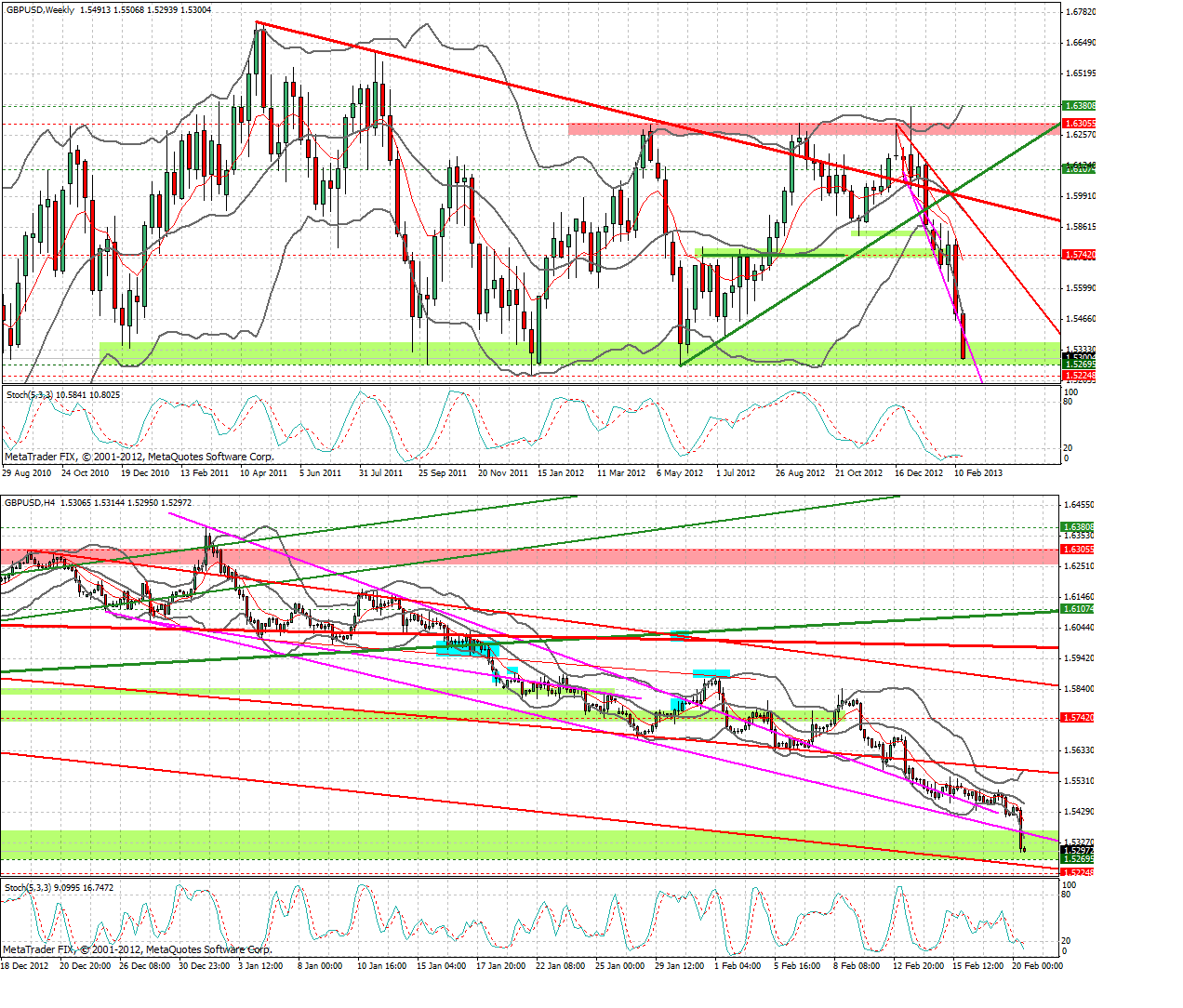 Auf Wochenbasis erkennt man ein großes fallendes Dreieck mit einem Dreifachtop im Bereich 1,63, was zugleich einen Fehlausbruch aus dem übergeordneten Dreieck bedeutete.