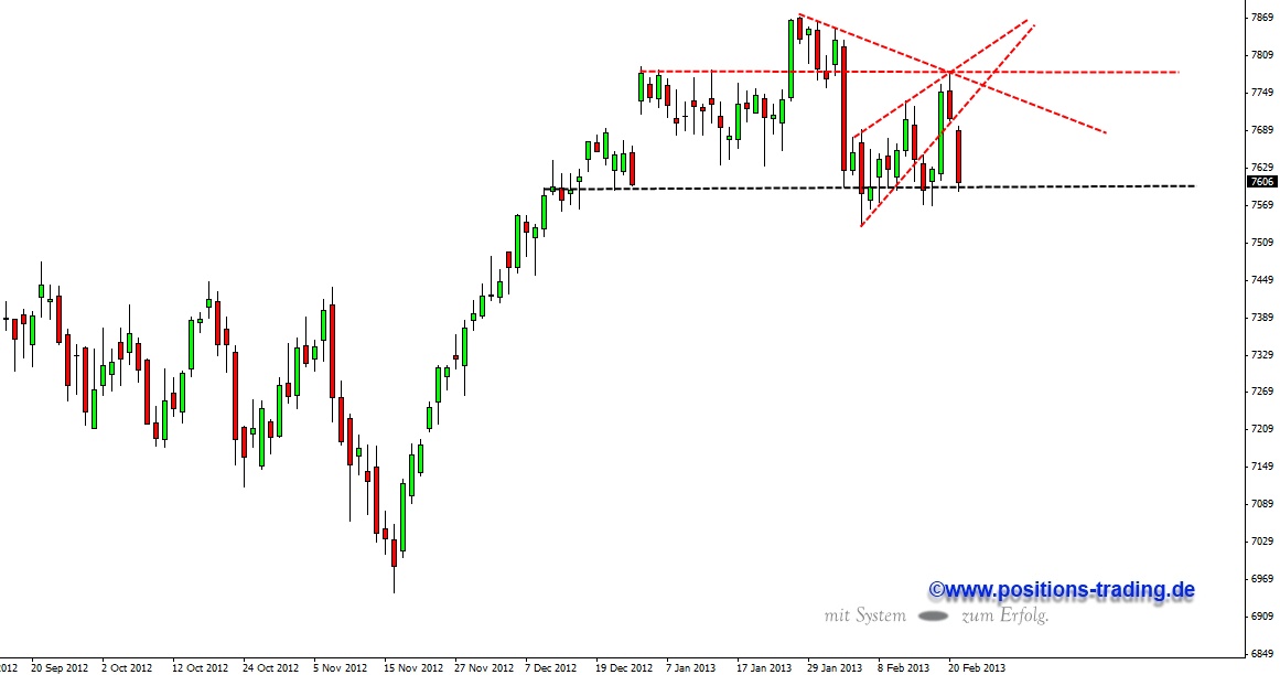 Heute melden sich die Verkäufer eindrucksvoll zurück und drücken den DAX an die untere Begrenzung der Schiebezone bei 7600 Punkten.