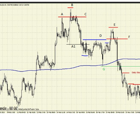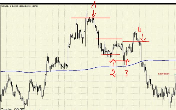 Durch Überschreiten des HW Punkt C sichere ich diesen Haupttrade Short 1.1 bei Punkt A ab, sprich ich werde unter dem Strich ausgestoppt. Ich sichere den Haupttrade also mit einem Gegentrade, Longtrade 1.2 ab.