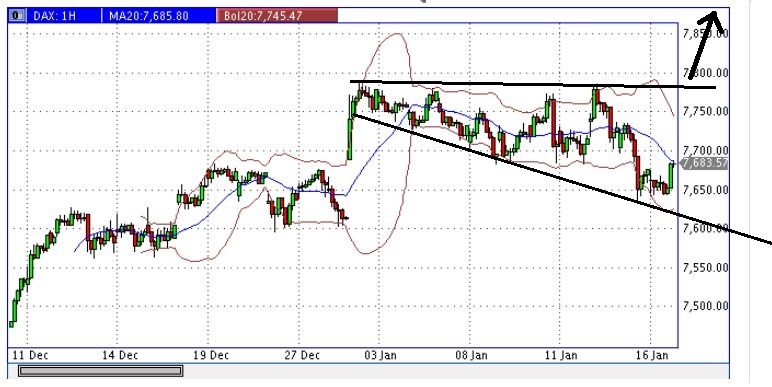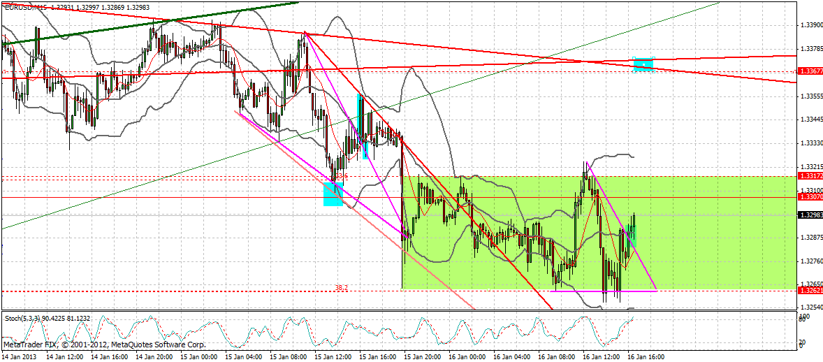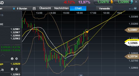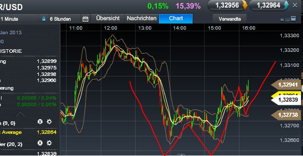 Heute hat der Euro die EMA 9 Tagesbasis bei 1,3256 punktgenau getestet und ist eben im 15er regelwidrig aus einem fallenden Dreieck ausgebrochen.