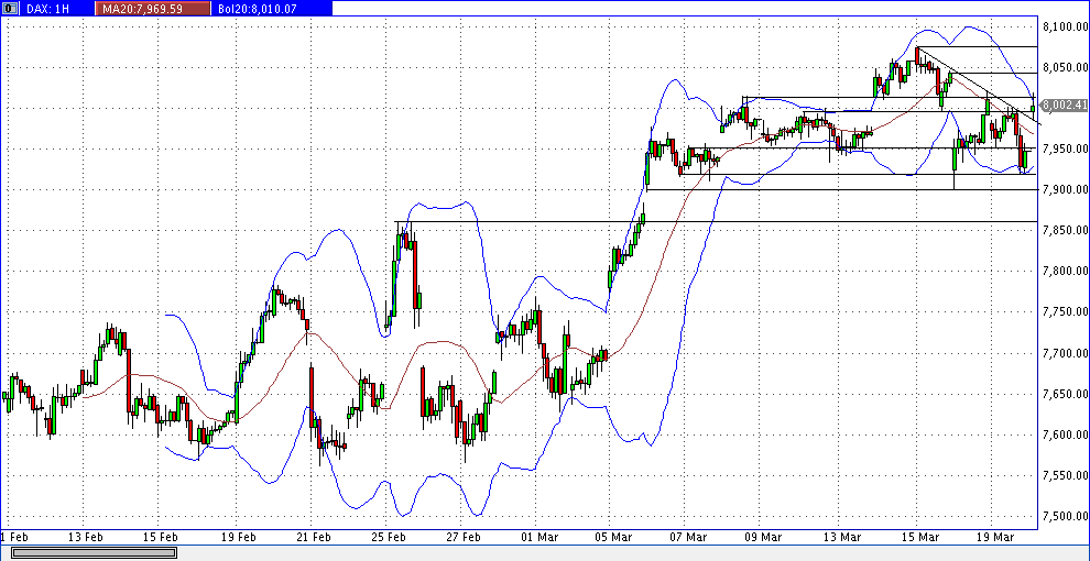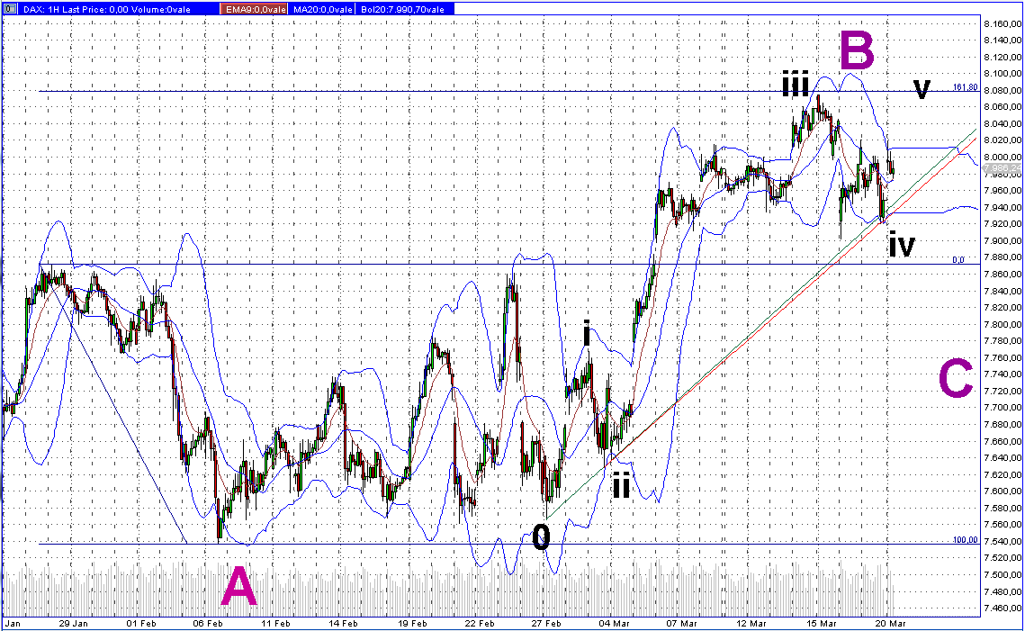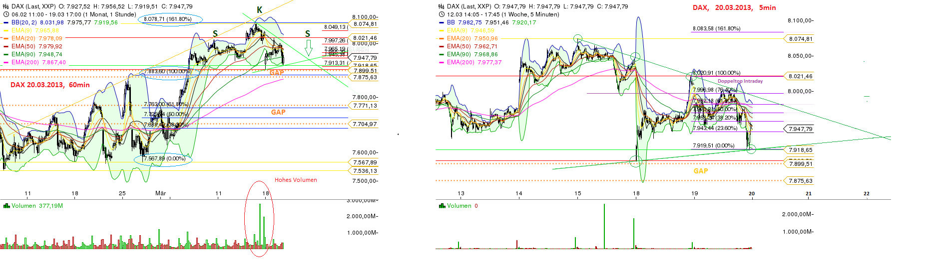 Mit 8.078,71 Punkten wurde ein neues JH erreicht. Dies bildete zugleich das 161,80% fibo vom letzten grossen Tief bei 7.567,89 und dem Tagesschluss vor dem obersten GAP ab. Mit erhöhtem Volumen wurde das JH erkauft - und hatte nicht lange Bestand....Der DAX- Kurs schloss kurz unterhalb EMA 90 im 60min- Chart bei 7.947,79 Punkten.