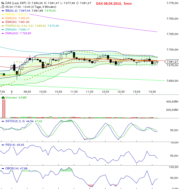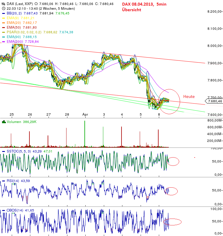 Jedoch kommt der DAx heute nicht richtig in die Gänge: dümpelt, wie Calmaco schon sagte, nur flaggenartig an der unteren, abwärts gerichteten roten Linie herum. (Siehe 60min- Chart unten)