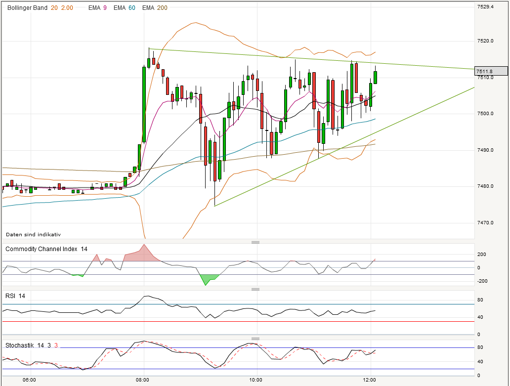 Klar ist der Dax Index im Nahbereich seiner EMA 200 bei 7408 und dem Ausbruchsbereich 7400.