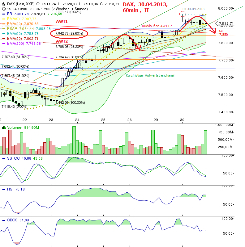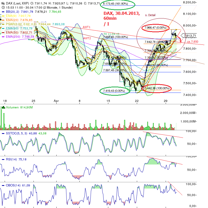 Es stehen jedoch wichtige Termine Morgen an (EZB um 13:45 Uhr, etc.), die auch oft für deutlich spürbare Kursbewegungen gut waren. Sollte die rote AWT1 NICHT halten und per Stundenschluss unterschritten werden, stehen das 38,20% fibo bei 7.766, das 50%er bei 7.704 und das dicke 61,80% fibo bei 7642 Punkten an....