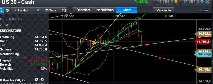 DOW steht jetzt, um 22:22 Uhr (1. Mai) bei 14.696 Punkten - knapp 1% im Minus. Dies läßt auch für Morgen niedrigere Kurse im DAX vermuten - Thema Down-GAP. Es würde hier ein "Island- Reversal" entstehen können... Wendeformation?)