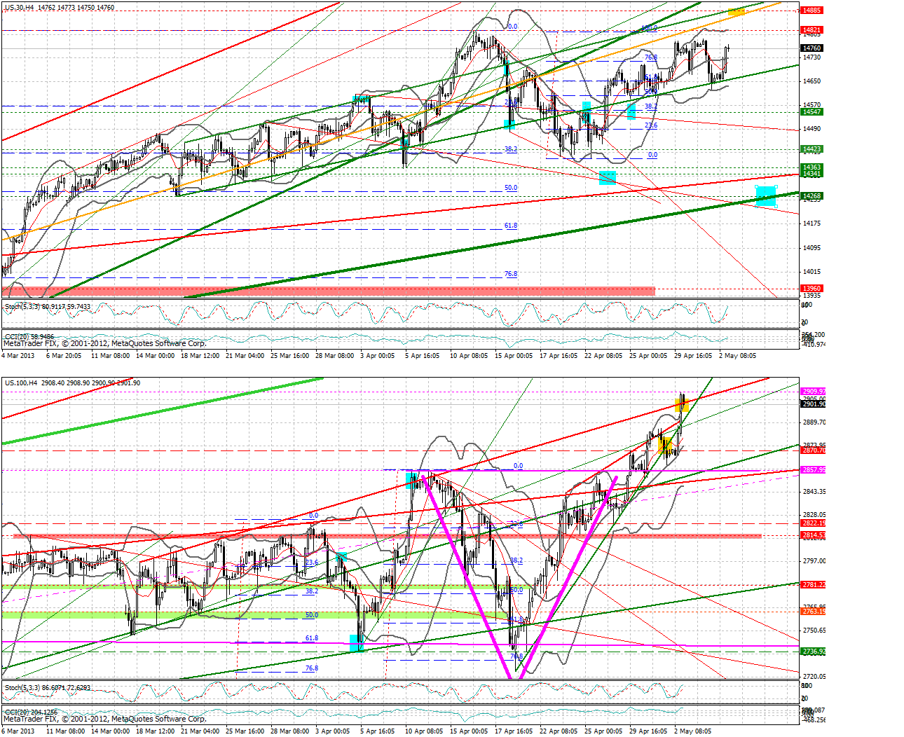 Das Mehrfachtopszenario im SP F und DF F kann zwar noch greifen. Behält der NDX F seine Trendstärke, wird daraus nichts und wir gehen TROTZ MAI noch eine Etage höher in den Indizes.