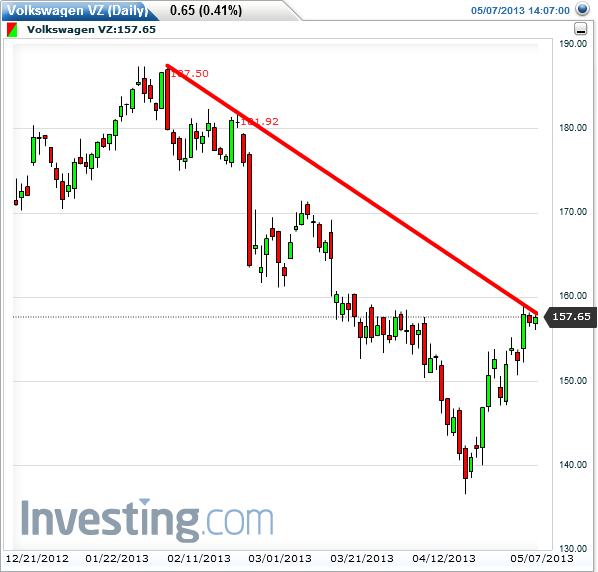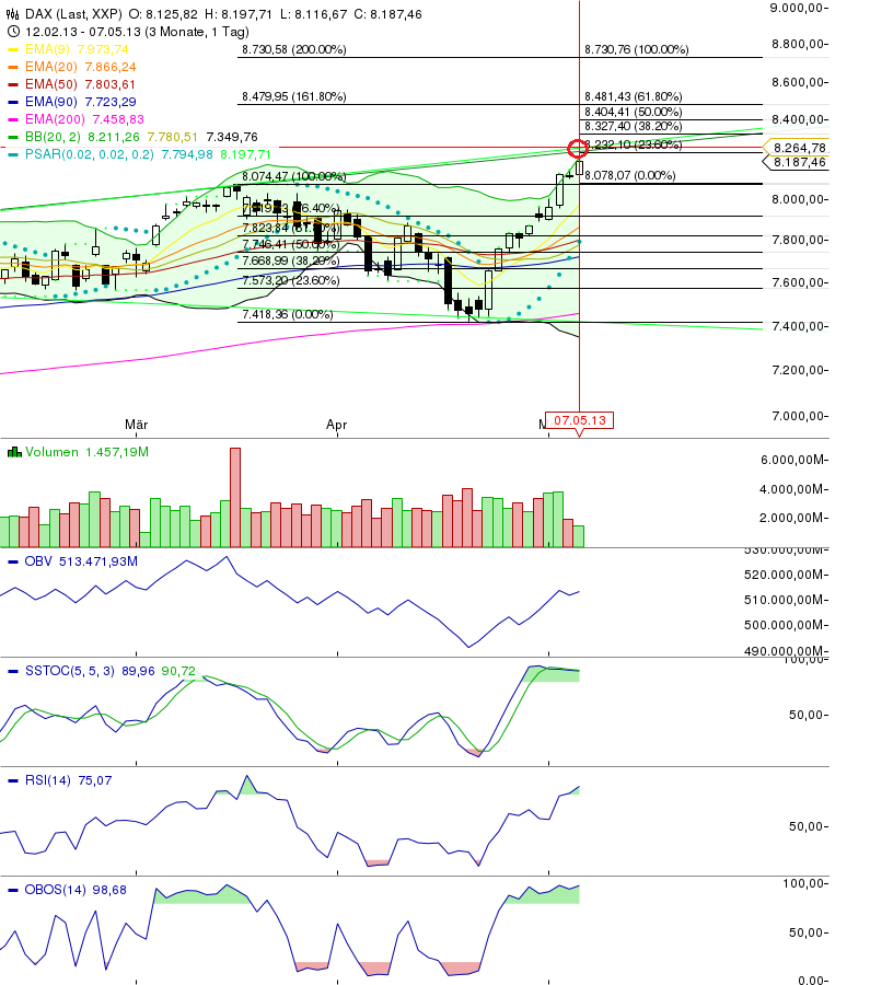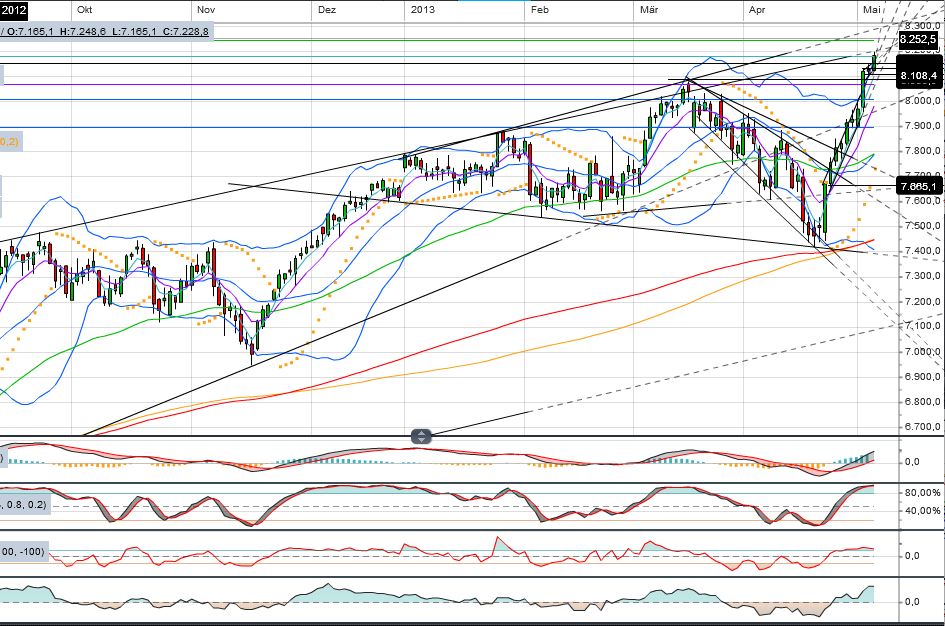 Die ca. 8.220, das oBB im daily, nannte schon bereits Calmaco. Sollte der Kurs hierüber mit Hilfe der US ausbrechen, könnte als Marke eventuell das 123,60%fibo bei 8.232,10 Punkten liegen; darüber würde der Chart recht bald an die OK des "broadening Tops" reichen. Dieser Punkt (rot, heute, 07.05.13) läge aktuell bei 8264,78 Punkten, ist nur mittels eübs wohl zu erlangen....wäre leicht ansteigend in den kommenden Tagen....
