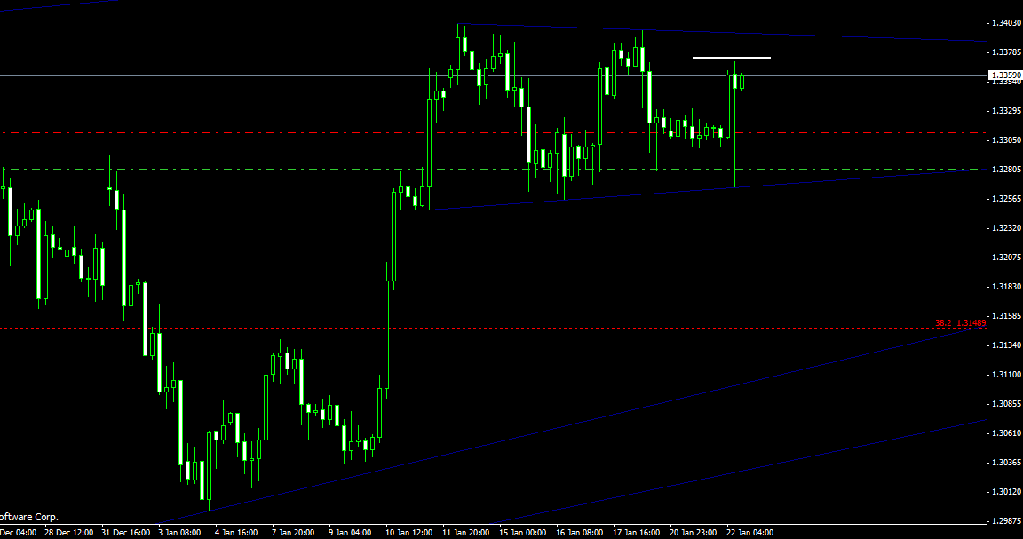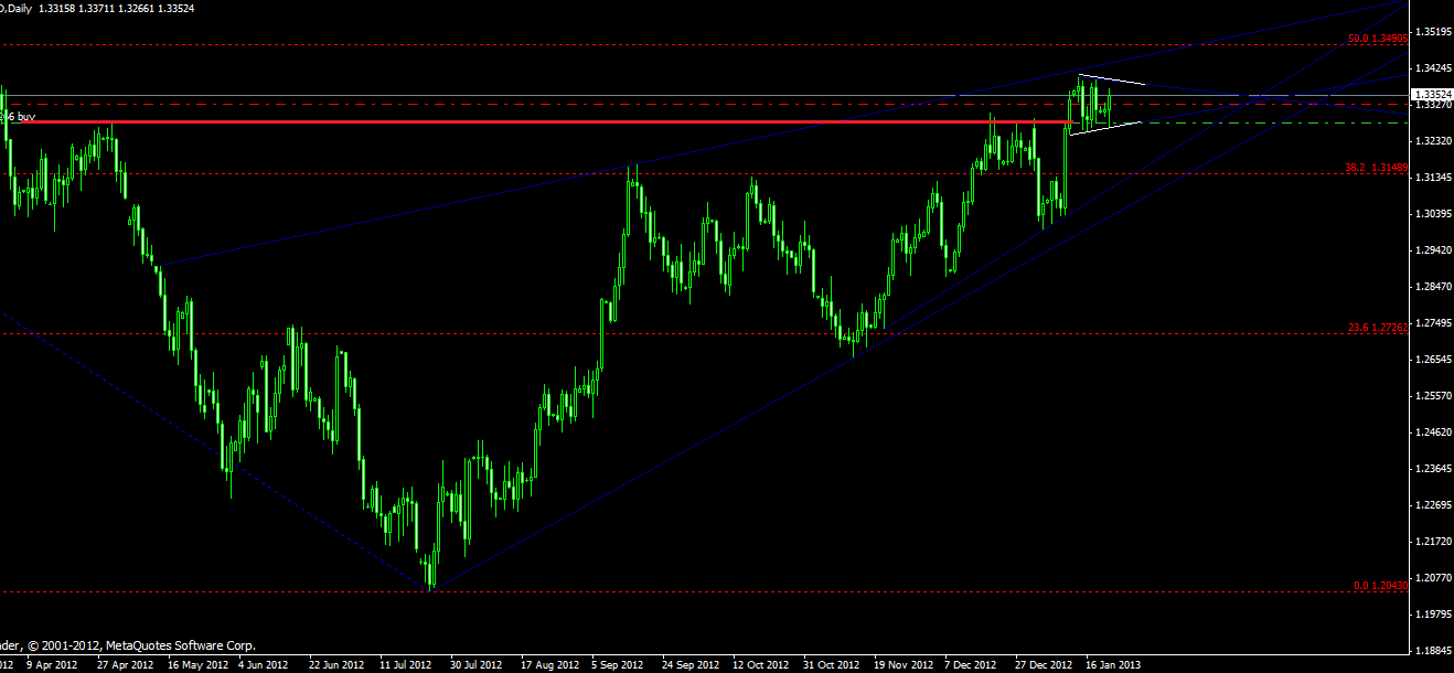Aber schaut man in den Chart könnte man einen Test des Ausbruchlevel im 1,327 Bereich vermuten. Dazu kommt der Mögliche Wimpel ( weiss) im Frage. Bis jetzt spricht für mich weiter alles nach Long aus. Die Konsolidierung wird wohl kurzer ausfallen.