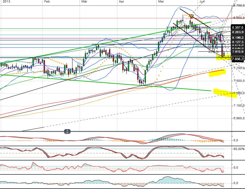 1.) Wir stehen inerhalb des großen broadening tops im Daily nun genau im Bereich der Mitte, der Formation, also dem Bereich, in den ein partial decline üblicher Weise zurückführt. Wenn wir da nun tatsächlich drunter brechen sollten, kann man m.E. allerdings nicht mehr von einem partial decline sprechen und müsste mit einem Rücklauf an das untere Ende der Formation das gerade bei ca. 7.300 verläuft, rechnen, wobei auf dem Weg dahin noch ema und sma 200 bremsen könnten.