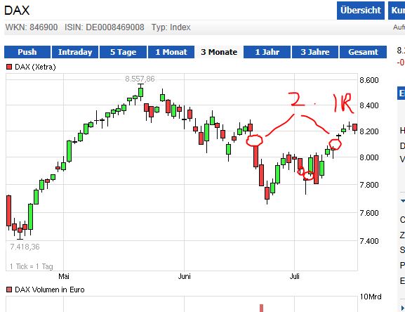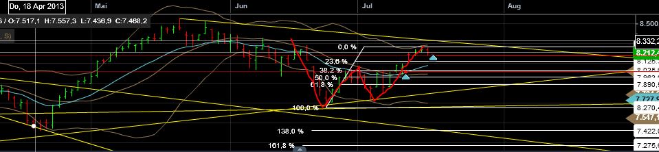 Fragt man sich was los ist? Im 1-h Chartbild ordnen sich gerad die Emas. EMA100 aufsteigend ...sehr positiv. Symmetrisches Dreieck mit Basislänge von 170 Punkten. Ich nehme - bedingt durch den Trend des EMA100 - einen Ausbruch nach oben an. Hier wäre das Ziel durch das Rechteck bei rund 8415 gegeben....hoffentlich....