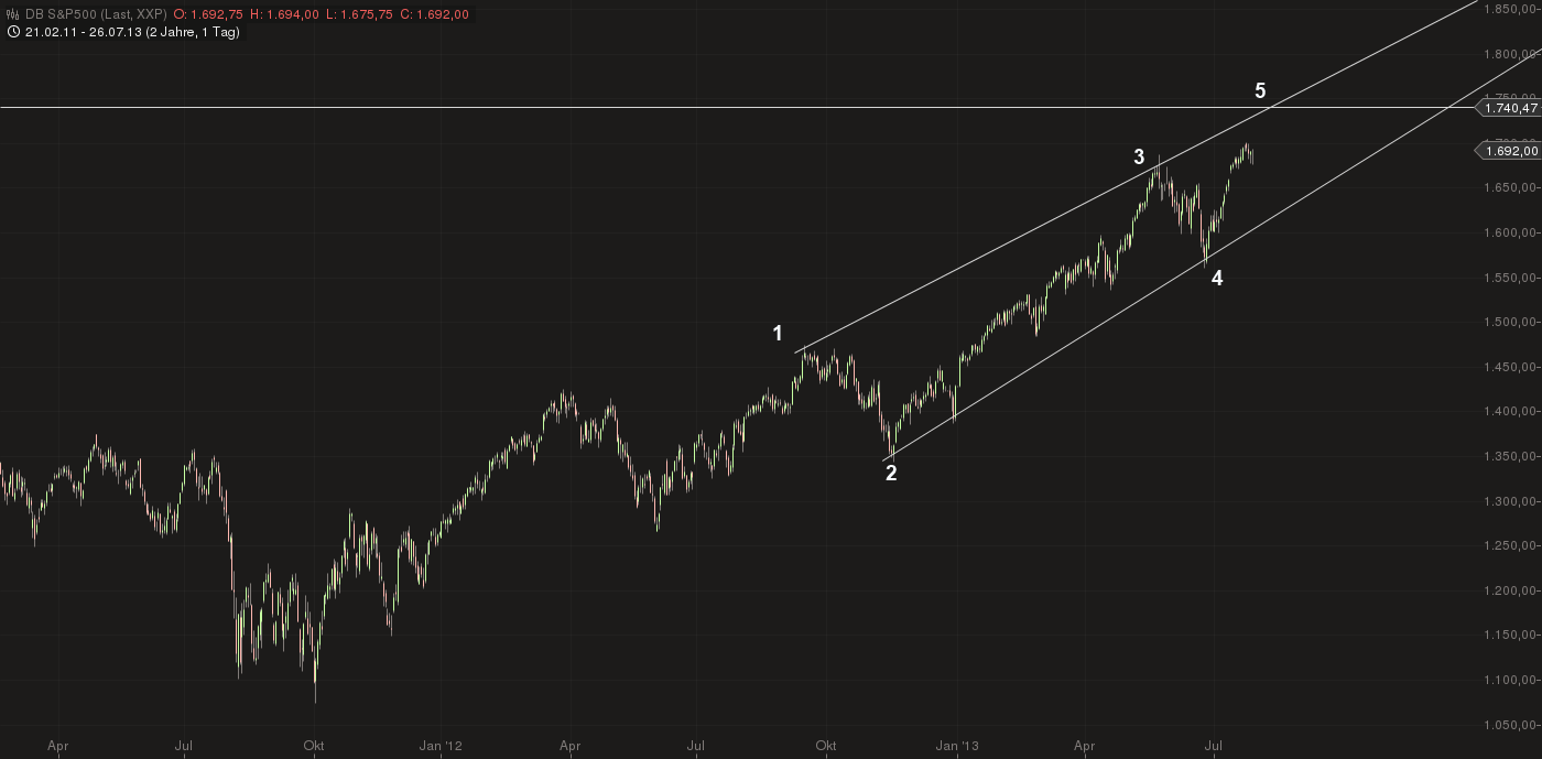 Zum S&P500: Deine Beobachtungen zum S&P decken sich ganz mit den meinigen: Das 161% fibo der Welle "3" der "V" (pink) läge bei 1.717,82 Punkten....