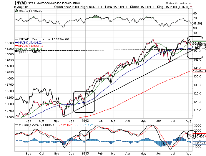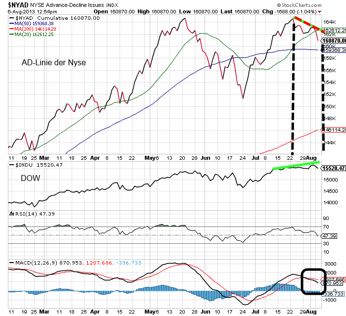 So, ich glaub, ich kann jetzt eine Prognose für den Dow machen: Grundlage ist die oben erwähnte AD-Linie. So eine ähnliche Situation wie 2013, linkes Rechteck. Dort ist die an der MA50 abgeprallt. Und da ist sie jetzt auf dem Weg. Damit erteilt sie dem Dow, sich ebenfalls auf dieses Niveau zu bewegen, welches etwa 15 200 für den Dow bedeutet. Dort steht wieder eine Entscheidung an: Abprall? Dann geht es steil aufwärts. Kein Abprall? Dann dürften wir beim Dow auf die 14500er Zone kommen.
