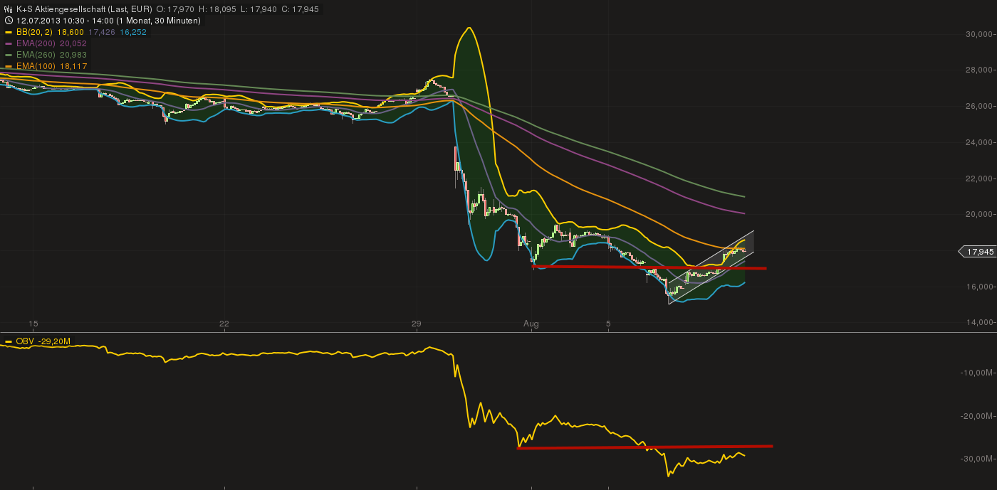 Der Chart suggeriert zwar einen Ausbruch über die rote Linie....Und der Kurs verläuft in dem Aufwärtskanal...aber das OBV Signal. welches für das Handelsvolumen dasteht, sagt das noch nicht...ein Abraller des OBV Signals hätte einen neuen Ausverkauf zu Folge...Luft wäre nach oben hin im Moment im Rahmen eines weiteren Impulses bis 19,50...im Moment fungiert die EMA100 als Widerstand.....könnte jetzt schon aber auch abprallen...
