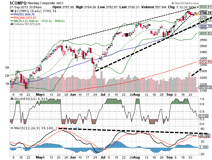 Der stärkste Index ist der Nasdaq Composite....Hier ist das Volumen sogar steigend...aber viel Luft nach oben ist nicht gegeben.....bewegt sich eher zäh auf den mBB Richtung Unterstützungslinie....Stoch RSI Richtung Verkaufszone, MACD kleiner Apraller wahrscheinlich....