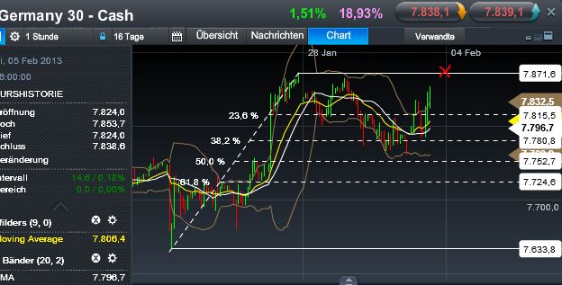 Eben testete der Dax das Erholungs 76iger. Und punktgenau die  darüber liegt die fallende, sich verbreiternde, umgekehrte Keilformation bei 7853 F