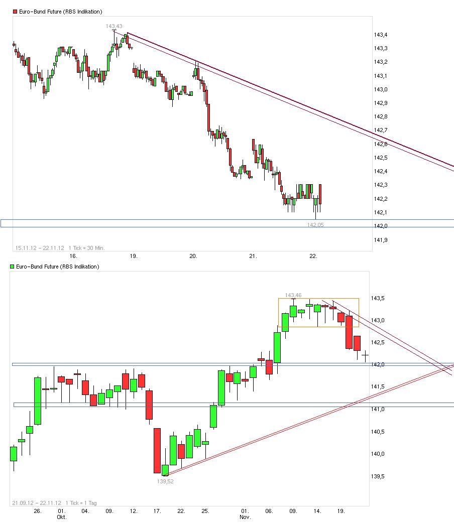 FRANKFURT (dpa-AFX) - Deutsche Staatsanleihen waren am Montag abermals gut gefragt. Händler nannten die insgesamt schlechtere Stimmung an den Aktienmärkten als Grund. Dort sorgten die anstehende Präsidentenwahl in den USA und die wieder aufkommende Unsicherheit in der Schuldenkrise für Kursverluste. Der richtungsweisende Euro-Bund-Future stieg bis zum Mittag um 0,18 Prozent auf 142,13 Punkte. Die Rendite der zehnjährigen Bundesanleihe sank um zwei Basispunkte auf 1,43 Prozent. Zweijährige Bundesanleihen wiesen erstmals seit Anfang September wieder eine negative Rendite auf. Die Euro-Schuldenkrise ist zurück im Fokus der Investoren. Nachdem es zuletzt so ausgesehen hatte, als würde der hartnäckigste Problemfall Griechenland um jeden Preis im Währungsverbund gehalten werden, kommen neue Zweifel auf. Denn in Athen steigen die politischen Risiken. Vor der Abstimmung neuer Reform- und Sparmaßnahmen, die Voraussetzung für weitere Hilfen sind, nimmt die Nervosität zu. "Allein im November muss Griechenland mehr als 5,6 Milliarden Euro für den Schuldendienst aufbringen - Geld, welches das Land nicht hat", erklärt Commerzbank-Analyst Lutz Karpowitz. ....