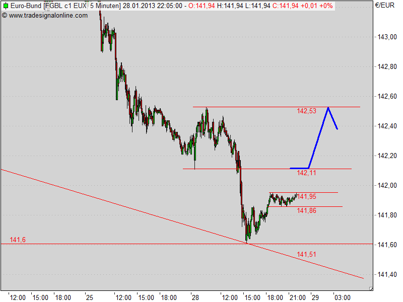 Jetzt kommt man allerdings an eine nicht unwichtige horizontale Unterstützung beim Bund Future. Die Region 142/141,8 könnte man als potenzielle Nackenlinie einer großen SKS ansehen. Also ich bin gespannt, ob da heute noch eine größere Gegenwehr einsetzen wird um diese Marke zu verteidigen. Was die BuFu Bullen bräuchten wäre mal wieder ein paar Tage schwache Aktienmärkte. Aber bislang wollen die einfach nur klettern. Also mal schauen wie lange die Aktien-Bullen das durchhalten.