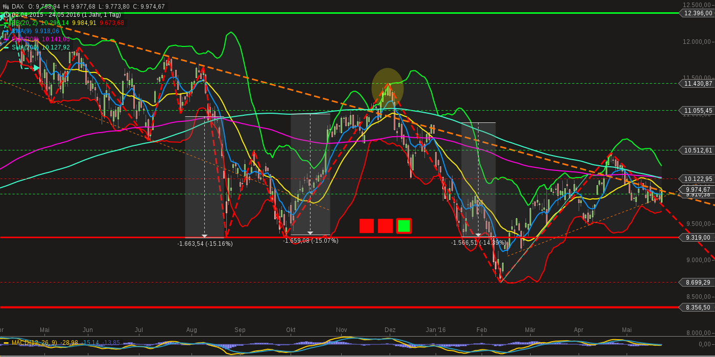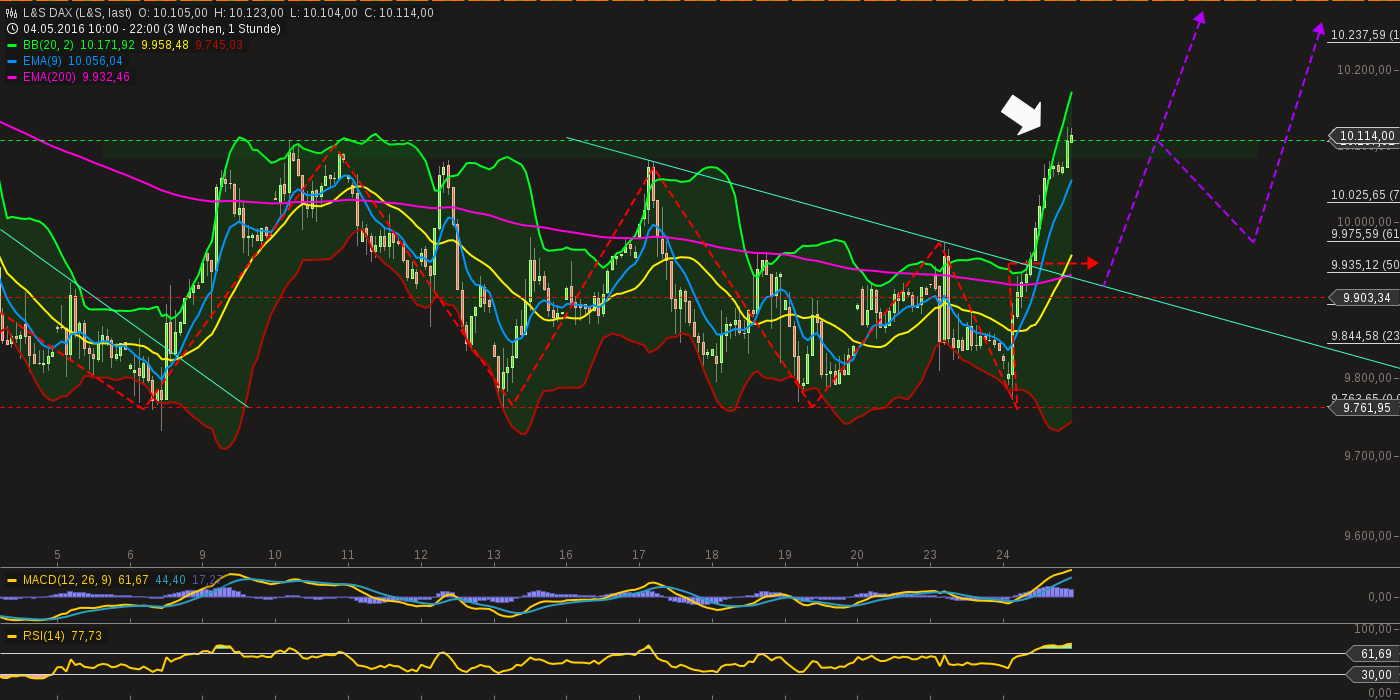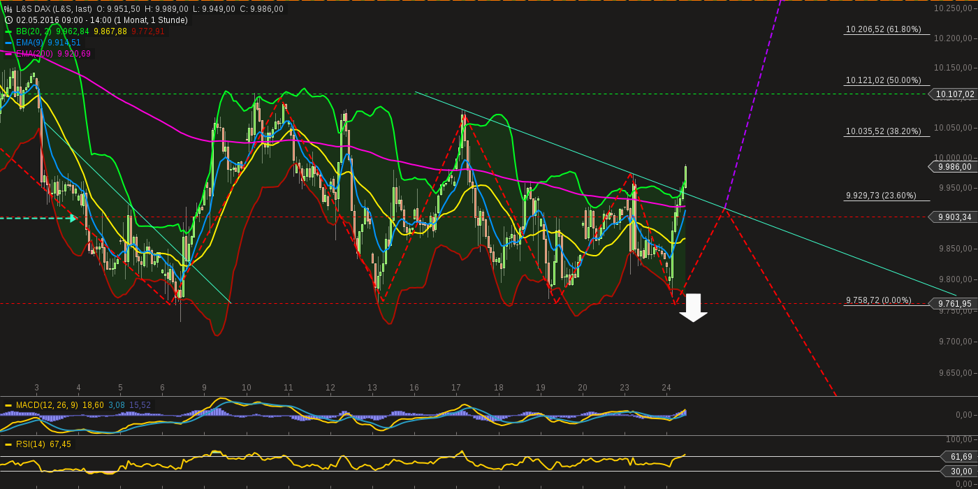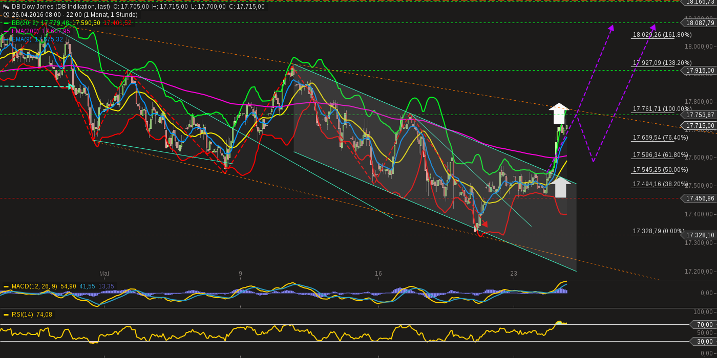 Tage(Progression): Die Korrektur verläuft kontrolliert in einer Flagge. Regelgerecht sollte diese nach oben aufgelöst werden. Dies würde zu neuen hochs führen - auch wenn sich das im moment noch niemand (inkl. mir) vorstellen kann. Zumindest ein Versuch ans OBB sollte drin sein.