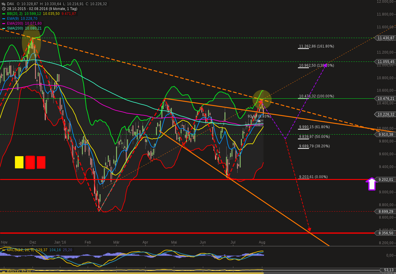 Dann wäre noch - sofern es kommt - ein Unterschreiten der 200-Tage Linie bei 10080 bärisch und auch der MACD könnte in den nächsten Tagen ein Short-Signal generieren, wenn die kurzfristige Linie die langfristige von oben nach unten durchbricht.
