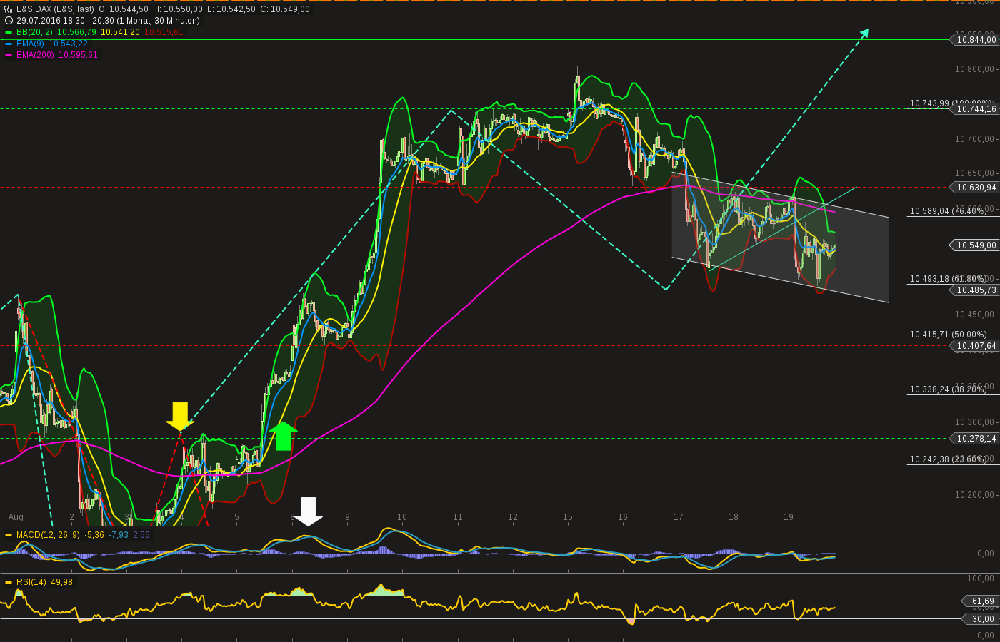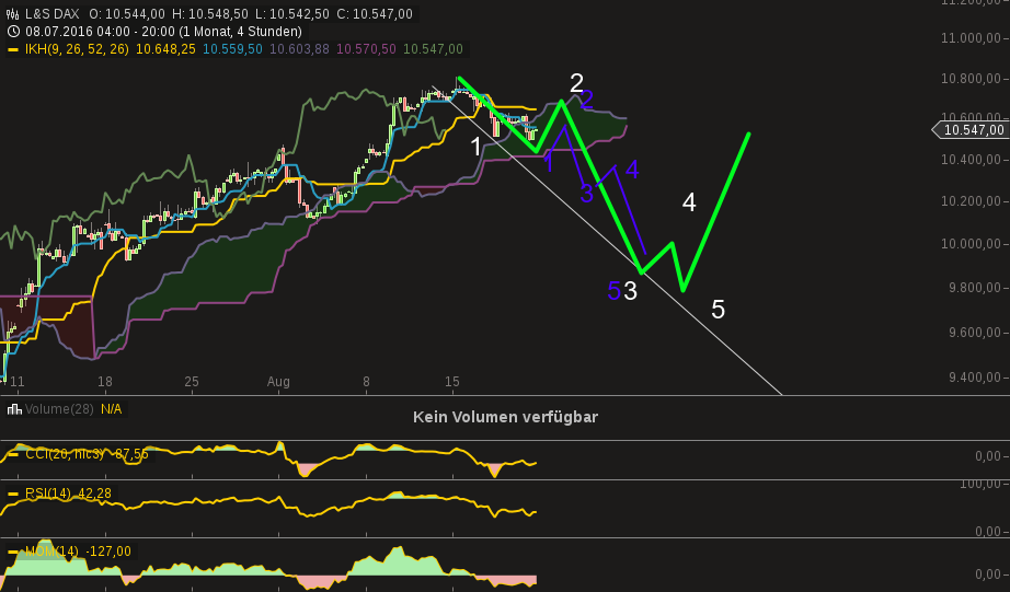 So jetzt zum Wesentlichen. Ich wollte mich jetzt auch mal an der Glaskugel versuchen und euch meine Sichtweise zu weiteren Verlauf im DAX darstellen.