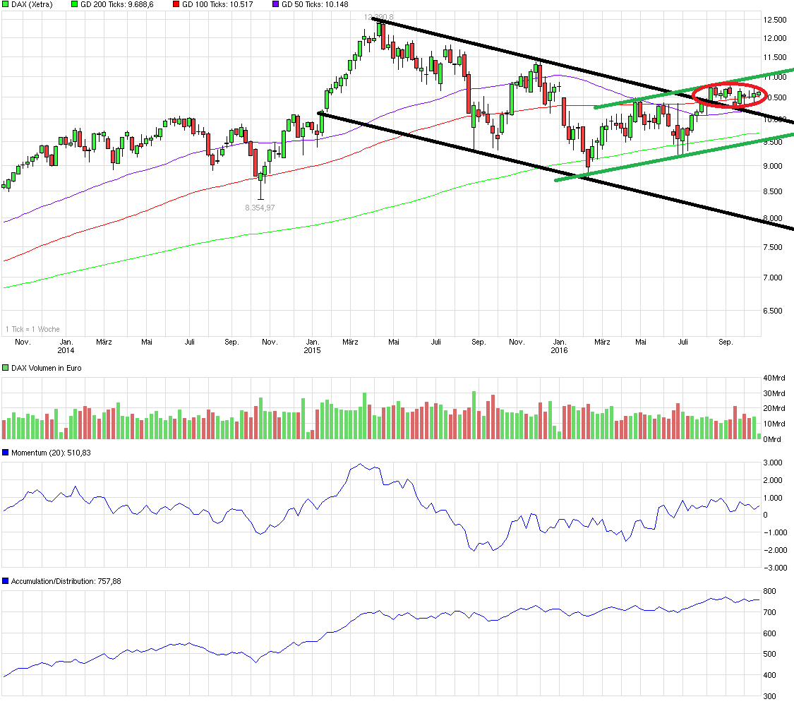 Die nächsten Impulse sind bekannt (Q3, Zinsschritte, US-Wahlen), aber einer (nur möglicher) wird meines Erachtens noch viel zu wenig beachtet: Mosul! Der Beginn der Offensive bringt noch einmal gewaltig (im Wortsinnne) Bewegung in die Region und wird weite Wellen schlagen. Ein unter Druck stehender Daesh, der todesverachtend zu allem bereit ist, wird diverse Szenarien durchspielen. Wenn es z.B. irgendwo in den US zu einem Anschlag vor den Wahlen kommt und dadurch evtl. als i-Tüpfelchen sogar doch noch Trump das Rennen macht, wars das definitiv mit der Jahresendente... äh rally.