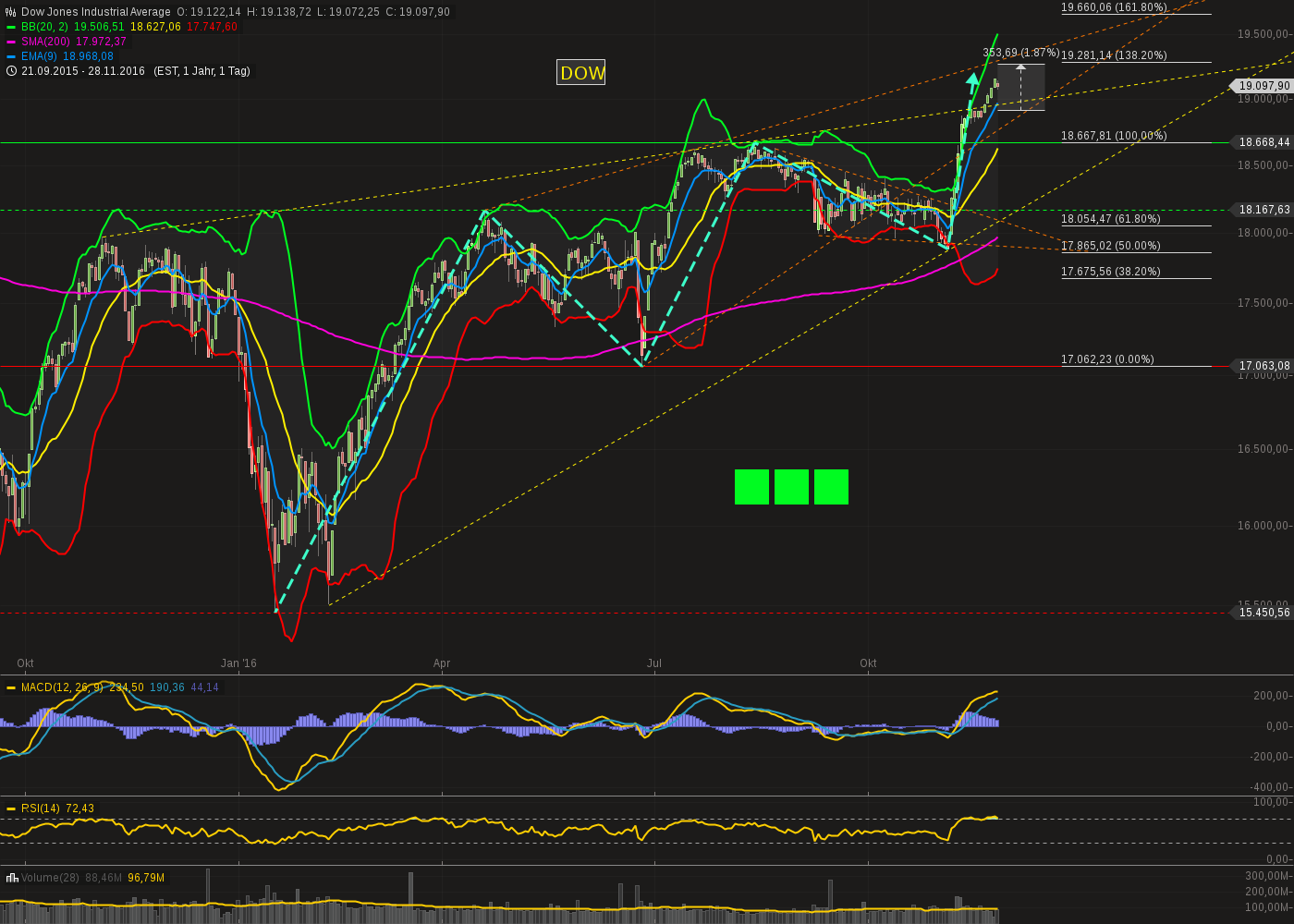 Echt Wahnsinn, wie der Dow unbeirrt nach oben wandert. Zwar bei immer niedrigerem Volumen (auch durch Feiertag geschuldet), aber prinzipiell kann das noch eine ganze Weile so weiter gehen. Verkäuferstreik in den USA?