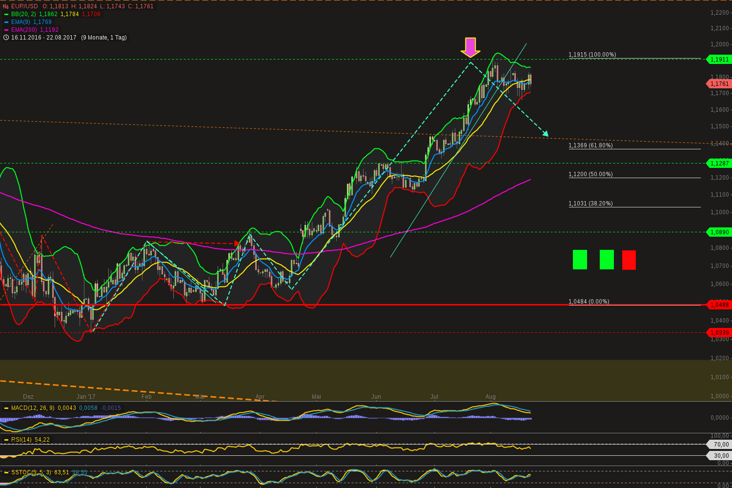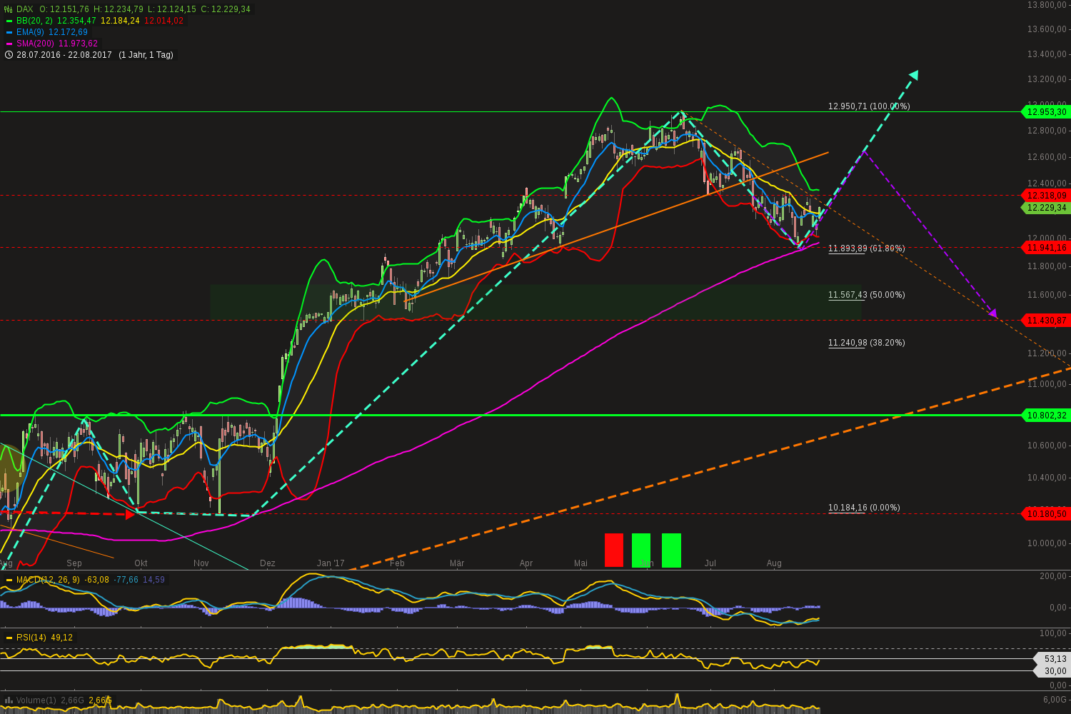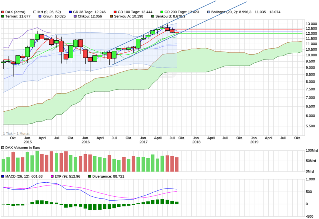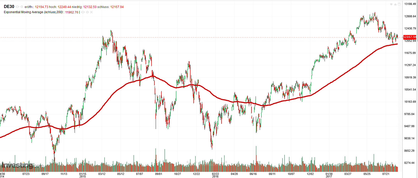 Schon richtig. Im Moment sieht´s so aus, als könne Daxi nochmal sein ATH erreichen, vielleicht auch ein neues generieren. Aber es gab in den letzten Jahren immer wieder Beschleunigungen, die können auch wieder mal in sich zusammenfallen (Trump, Korea, AKW, sonstwas...). Selbst dann, wenn er wieder auf seinen langjährigen Uptrend bei rund 8.000 zurückfiele - das wäre immer noch eine Verdopplung in knapp 10 Jahren, bei einem Rückfall auf 10.000 (blau) eine Verdopplung in rund 6 Jahren. Immer noch eine gute Performance - nur für den, der erst kürzlich gekauft hat, sehr schmerzhaft. Wir waren gerade wieder an der EMA, die könnte nochmal als Trampolin wirken, der Dax wird sie aber auch wieder durchschlagen (oder besser: die EMA den DAX, weil nachlaufend).