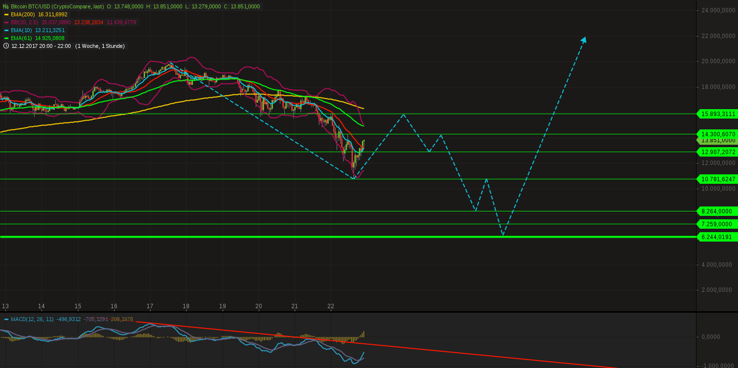 Denn eines ist (zumindest bisher, warten wir Anfang 2018 wegen der Steuerproblematik (viele können Steuerfrei verkaufen) ab), anders als beim China Crash usw im September, damals ist massiv Kohle aus dem Markt geflossen, imho ists aber so das die Kohle im Markt bleibt / und eher noch mehr wird. Somit gehen bei mir erst die Alarmglocken an wenn das Marketcap des Gesamtmarkts einbricht. Und ich hatte hier ja auch nur 20,2 drüber 21.2 prognostiziert. Und die 20,2 wurden lediglich um nen halben Prozent verfehlt. Insofern die CT greift auch hier. Und die 11k (61er vom Top letzte übergeordnete Bewegung) fände ich gut. Die 6-6,5 wären glatt nen Traum wo ich wirklich meinen Anteil des Gesamtdepotanteils von 10 auf 20% in Crypto aufstocken würde.