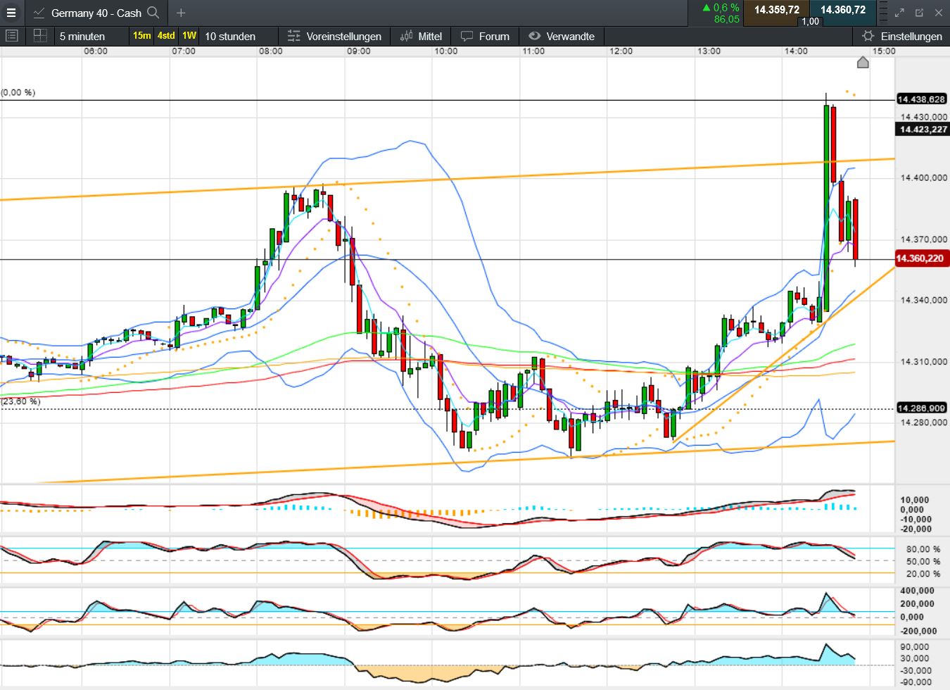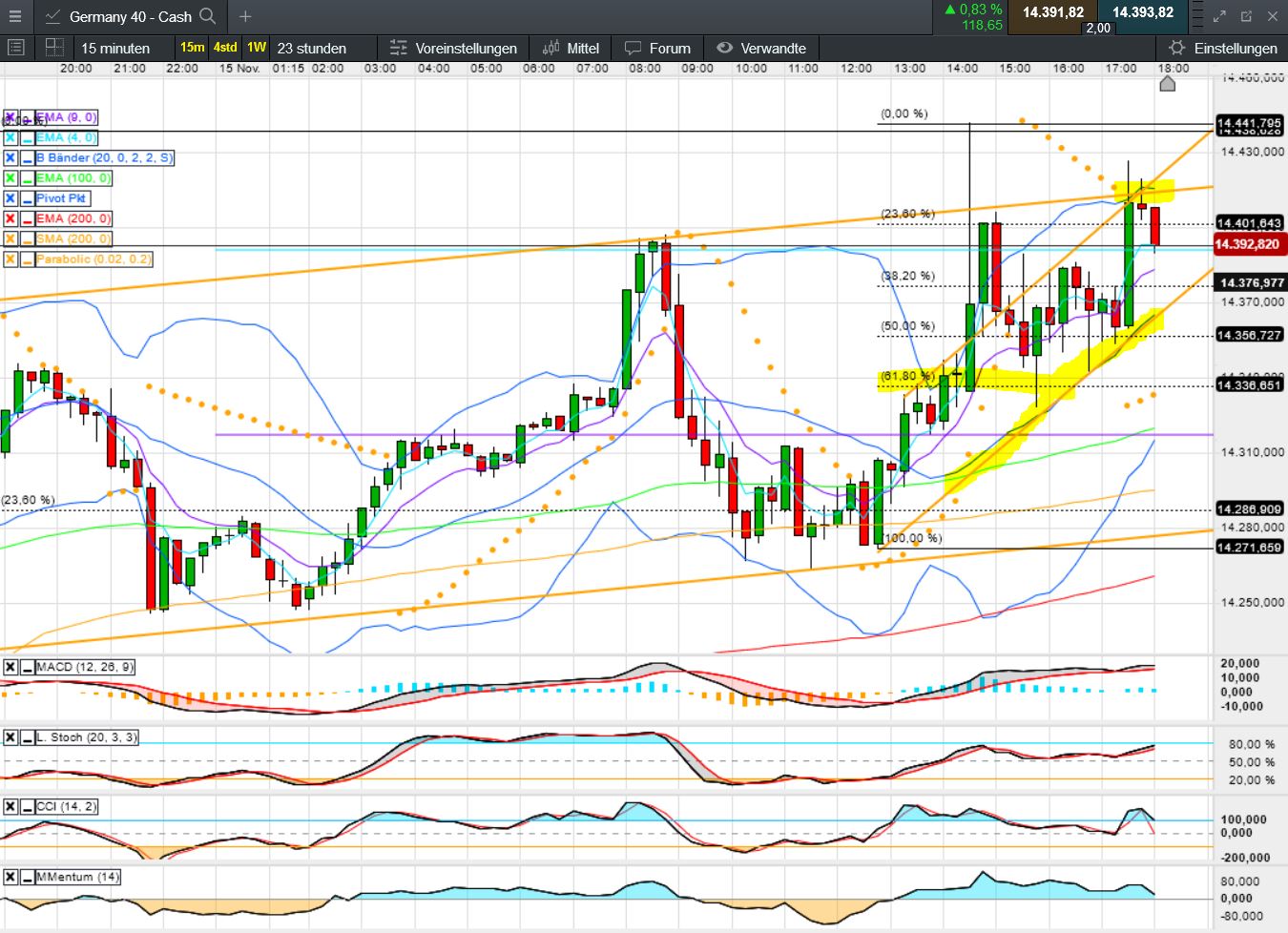 Die Übertreibung aufgrund der Erzeugerdaten wurde vorhin sofort wieder korrigiert,  seitdem ist der Dax dann allerdings wieder innerhalb des kleines Trendkanals (den ich unten im 15er zeige) wieder zurück zur oberen Trendlinie der engen Seitwärtskonsolidierung  hochgelaufen.