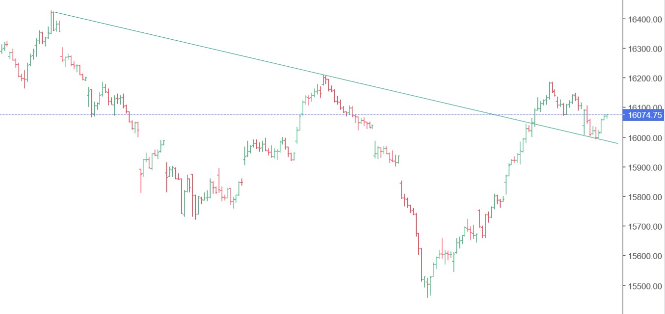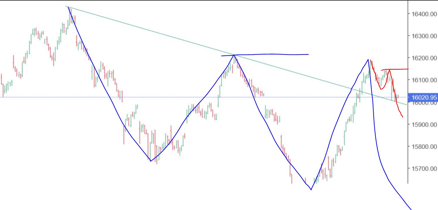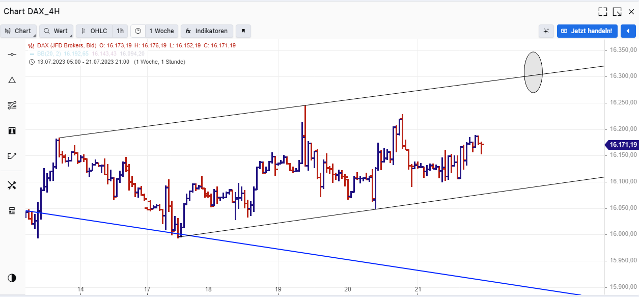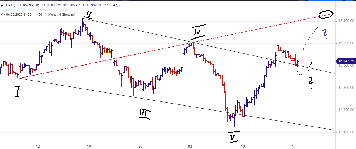 das ideale muster wäre ein anlaufen der jetzigen 2.nebenlinie - abprall um dann die hauptfigur abzuschliessen - dabei kann man alle richtungen handeln - ich empfehle aber sich selber eine hauptrichtung (long oder short)auszusuchen und diese innerhalb der figur immer wieder an markantren stellen wie bei long z.B. die absprünge zu handeln