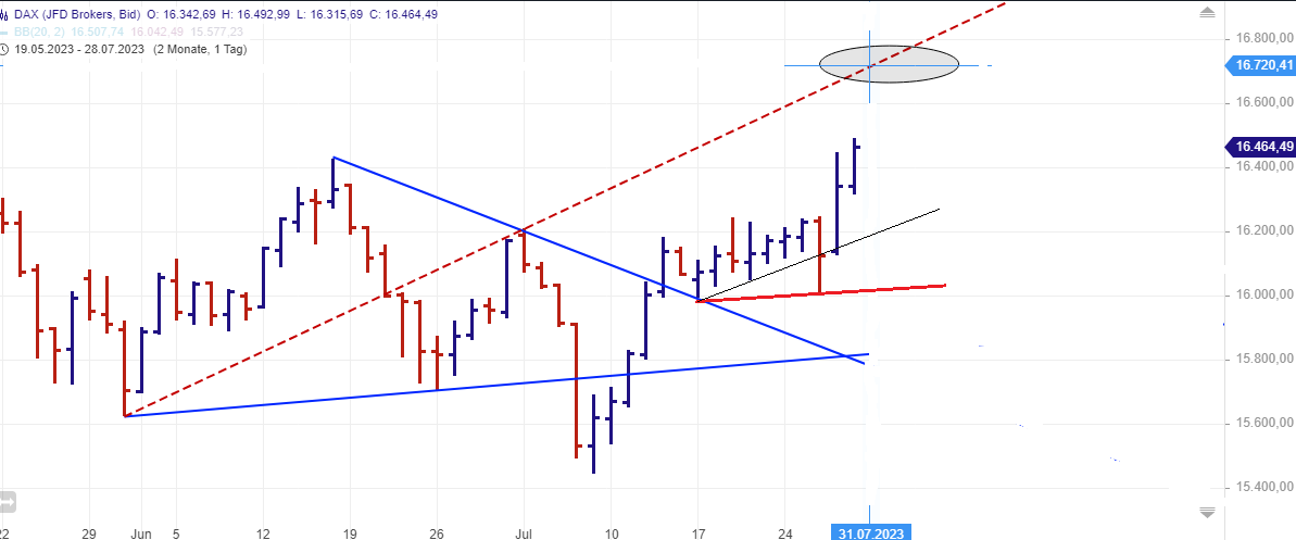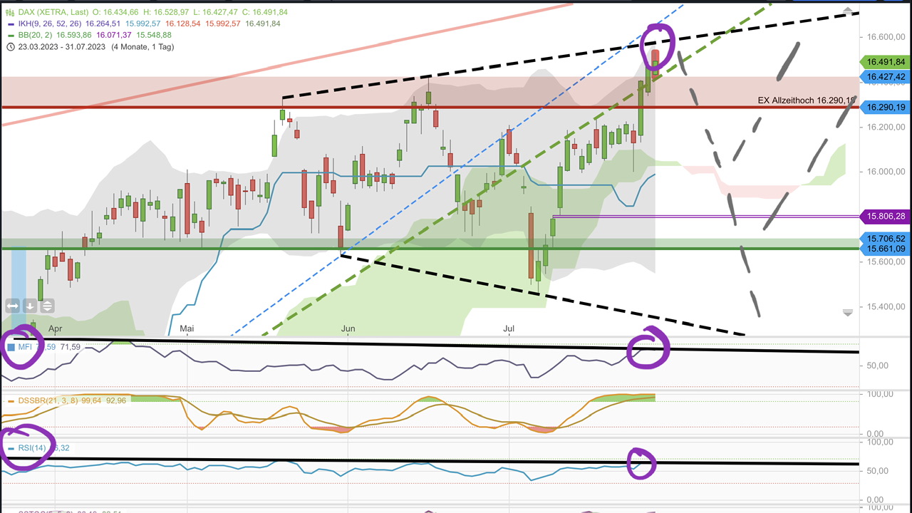 Was mir jedoch immer wieder hilft (was ich gerne in der Vergangenheit vernachlässigt habe) ist, dass ein Blick weiter raus aus dem Chart (4h / 1d) Klarheit schaffen kann. In meinem Chart habe ich eine Unterstützung die aus dem Tief vom 20.03. resultiert "gefunden". Im Bereich um den 5-10.07. wurde dies nach unten durchbrochen und dann mehrfach unten wie von oben getestet und für gut befunden. Diese Unterstützung wurde gestern wieder nach unten gebrochen, mehrfach getestet und schaffte sich zum Xetra-Schluss wieder drüber (was aus meiner Sicht wichtig war). Ich erwarte heute noch vor US-Start ein mehrfaches Testen dieser Unterstützung, allerdings sollte der Dax meiner Meinung nach nicht mehr unter die neue "gestrichelte" Linie fallen.