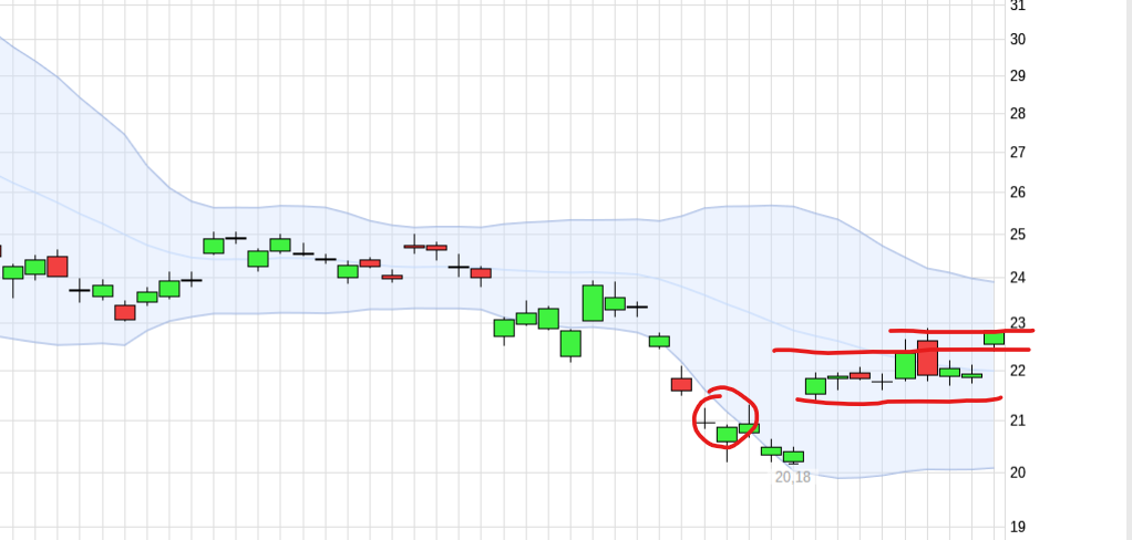 jetzt zum abbau der übertreibung: ein abbau hat in beiden systemen stattgefunden wenn kontakt zum mittleren bollinger stattfindet - das durchlaufen auf unteres bollinger ist sozusagen die kirsche auf der torte und hier kommt wie beim späteren betrachtungen eine eigenart des bb zum tragen - manchmal gibt es just in time eine übertreibung (kerze startet ausserhalb des bb)aber durch die art wie bb berechnet wird sieht es päter so aus als wäre sie auf dem bb oder sogar drinnen gestartet darum haben wir als wir uns zuerst damit befassten nicht viele belege gefunden - wir sahen die übertreibung im nachgang gar nicht mehr - die entscxheidung fällt aber just in time qenn der kurs entsteht