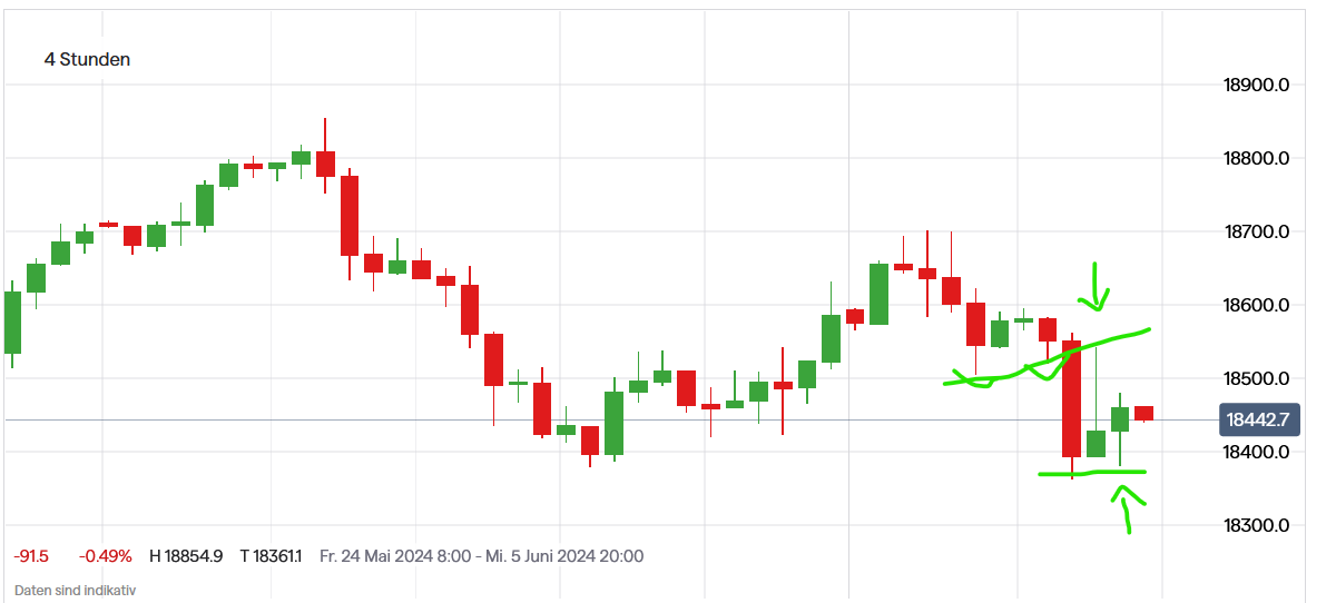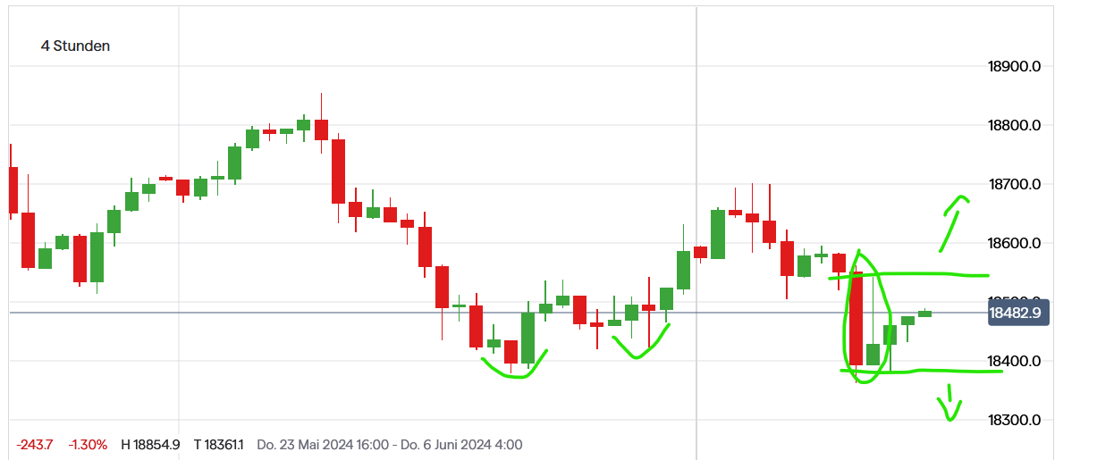 kurz zum dax: lange kerzen stellen für sich einen breiten support in der raum, der keine aussage hat - erst mit bruch eines bereichs oder nennen wir es verlassen der wartezone wird eine aussaage getroffen dann jeweils zum ende des jeweiligen timeframes (als Bspl 5er am ende der 5min, 240er am ende der 240 min usw usw)