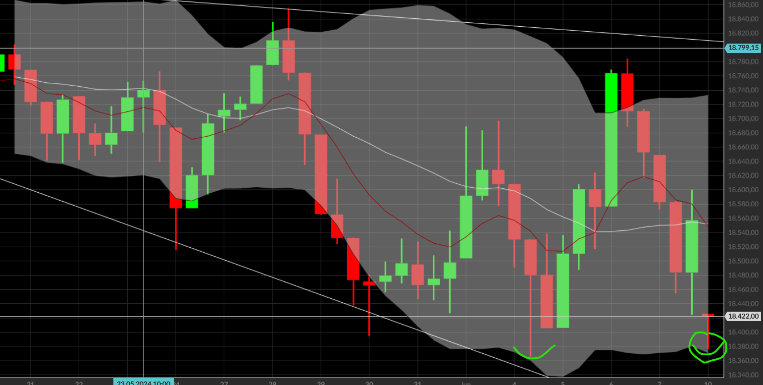darüber hinaus hatten wir am 05.06. eine untere bullishe übertreibung am bb - ok das daily bb ist sehr träge - hier reagierte es und hingewiesen wurde ja bereits drauf - die den kurs mit hoher wahrscheinlichkeit über ema9 und mbb ans obb führen sollte - dies ist nicht geschehen - es wurde aus dem bnr des 240er heraus vor dem ziel verkauft ......