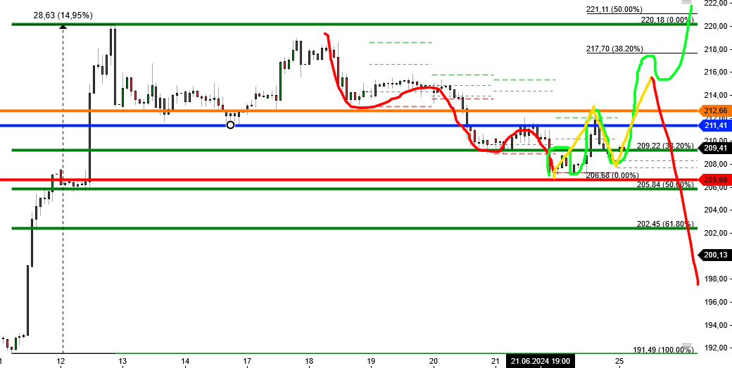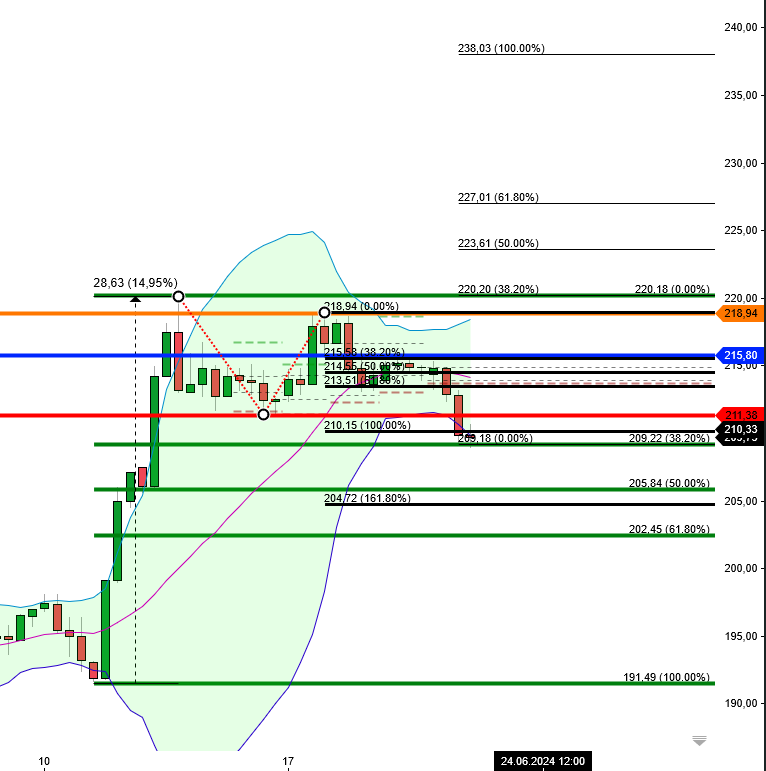 Erster Anhaltspunkt wäre überschreiten des letzten ZT bei 211,38 denn dann wäre es auf der einen Seite ein Rebreak und laut Elliot eine Überschneidung was das auf korrektiv abwärts bestätigt. Trigger nach oben blau oder orange – SL das heutige Tief.