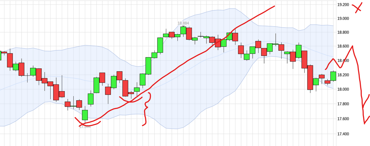 3. Es könnte ja auch gar keine Korrektur werden sondern der neu geborene kleine Abwärtstrend könnte sich beschleunigen und auch einen Trendbruch im größerem einleiten.