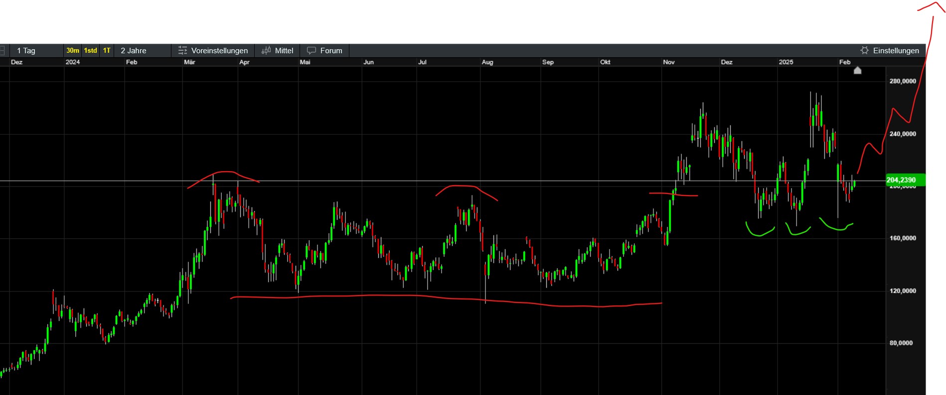 nach ct wäre bei bruch ein potential von annähernd 18-20k vorhanden - höhe des seitwärtsbereichs on top - (dann stünden wir bei grob 120k - die gier insbesondere von kleineren anlegern wird dies noch beschleunigen weshalb ich im abgelaufenen quartal mal sagte ziel btc liegt irgendwo bei 135k - das ist markttechnik sie bezieht emotionen mit ein (u.a.)