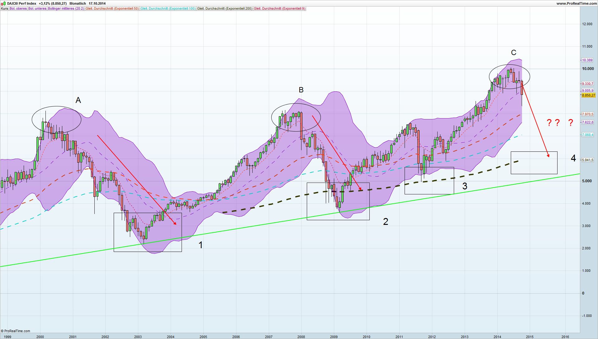 Mit Buchstaben habe ich wichtige Extrempunkte markiert, Punkte , die am weitestem von EMA 200 liegen : A,B,C. Im Jahr 2000 lagen ca.4000 Punkte dazwischen ( Punkt A ), im 2007 ( Punkt B) ca. 4000 und heute bzw. noch im August 2014 wieder mal diese 4000 Punkte. Und schon 2 Mal in der Vergangenheit führte dies zu EMA 200 ( Punkt 1 und 2) !