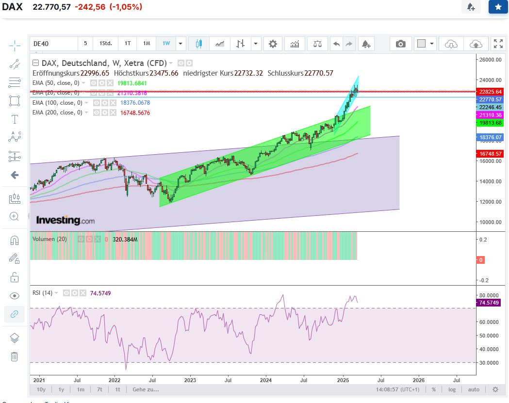Aber man beachte den extrem hohen RSI im Weekly. Das erklärt meiner Meinung nach auch