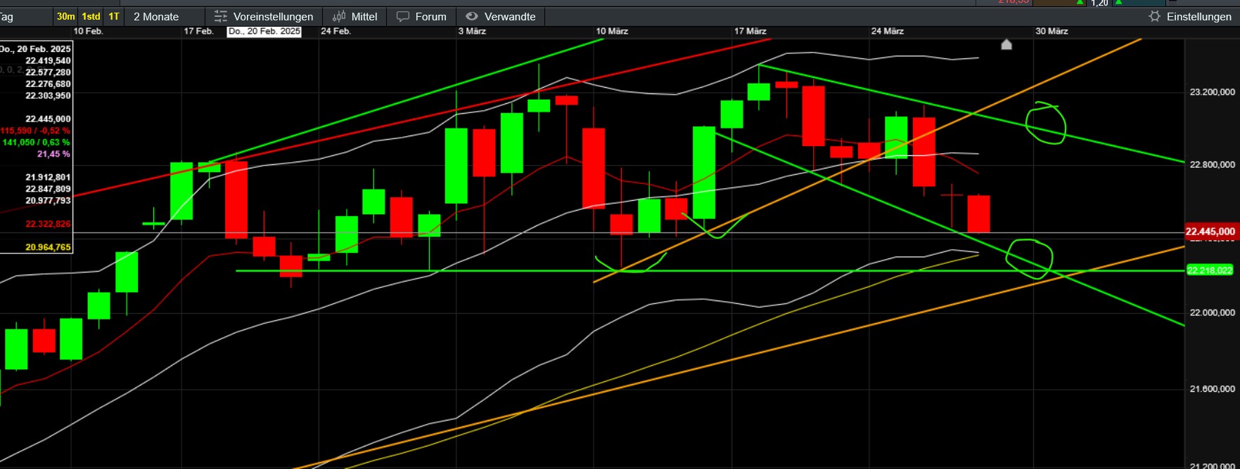 nachher mehr zum ndx - die wedge in wedge hatte ich ja bereits gezeigt - daraus lässt sich noch einiges ableiten BEVOR wir in einen "bärenmarkt" dort kippen - obs dann so kommt werden wir sehen