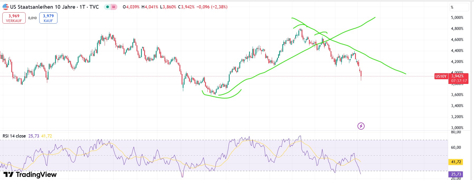 achtet auf die us10y - mit jeder neuen zollankündigung denn das ist noch nicht das ende wird es neue tiefs geben wobei sie sich jetzt erstmal erholen sollten - das nimmt weiter liquidität aus dem markt die unsere pläne wahrscheinlich auf ende des jahres verschieben wird