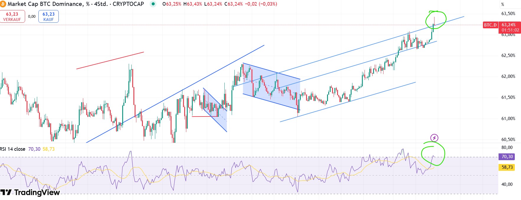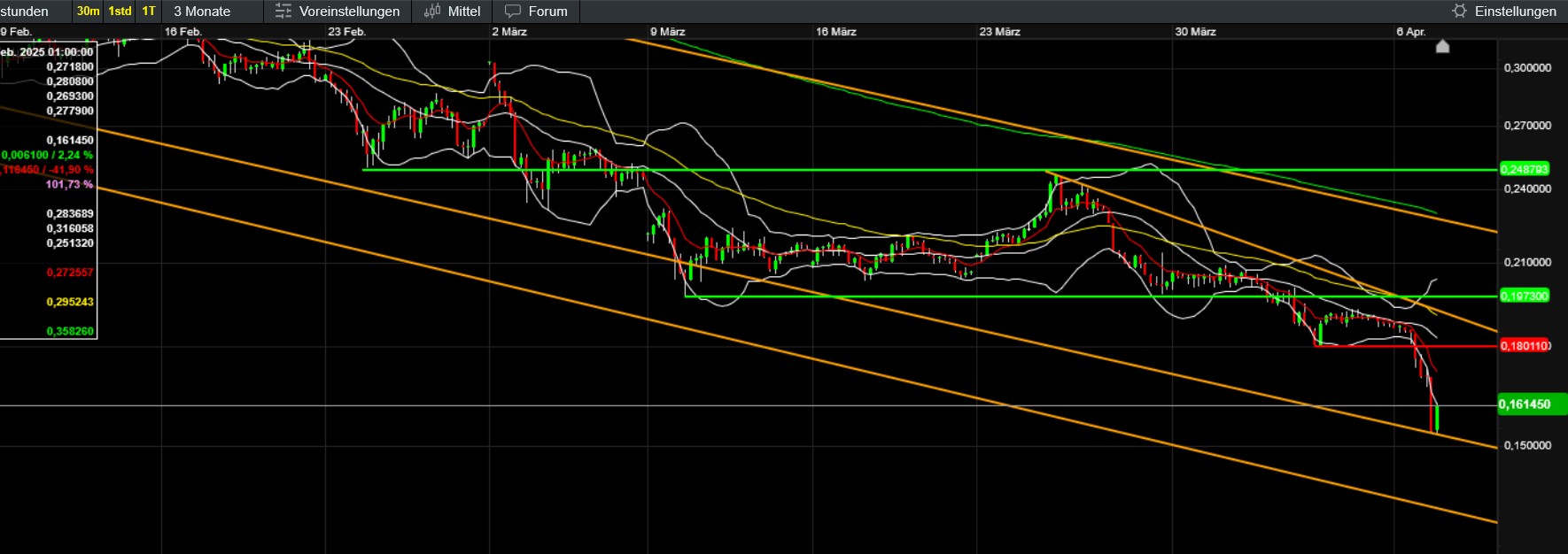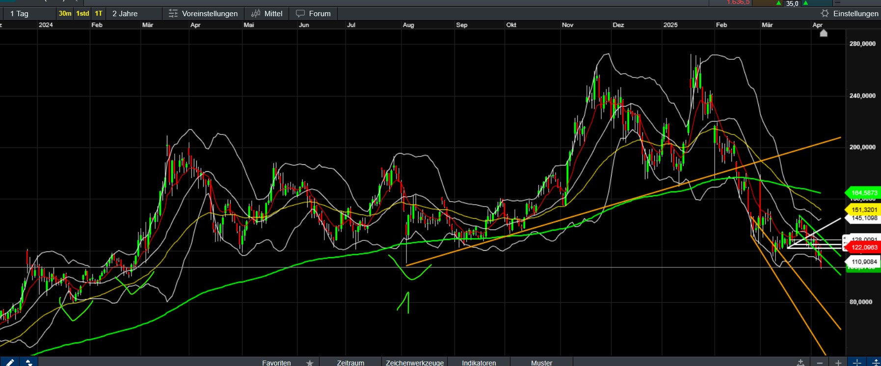 Bitcoin hält sich mE vergleichsweise noch recht gut, insbesondere solange 76591 halten. Dann wie du sagst auch ganz gut unterstützt. Die Aufwärtstrendlinie seit Oktober 23 (dzt. bei rund 70.000) könnte mE auch wichtig werden. Bricht die könnte es aber ev. wieder in die Zone 70.000- knapp unter 50.000 (flache Aufwärtstrendlinie seit Nov 22 - dzt rund 47000, ebenfalls grün) laufen, wo dann mE schwer abschätzbar wäre, wo sich der Kurs stabilisiert. Mühsam das ganze aber ich bleibe nach wie vor zuversichtlich, passe mit Nachkäufen aber noch auf.