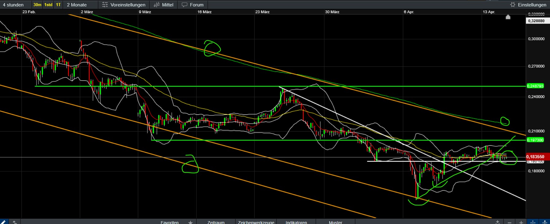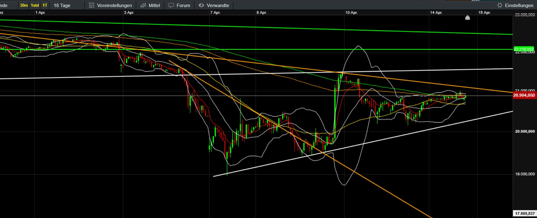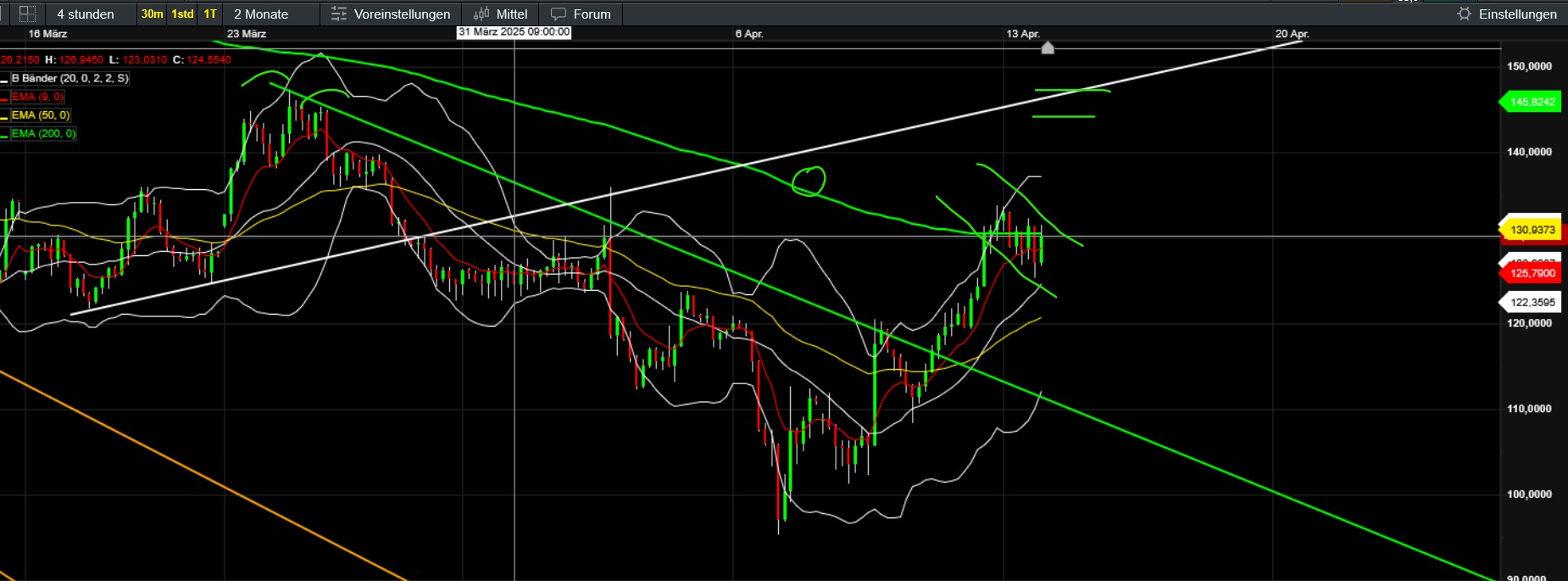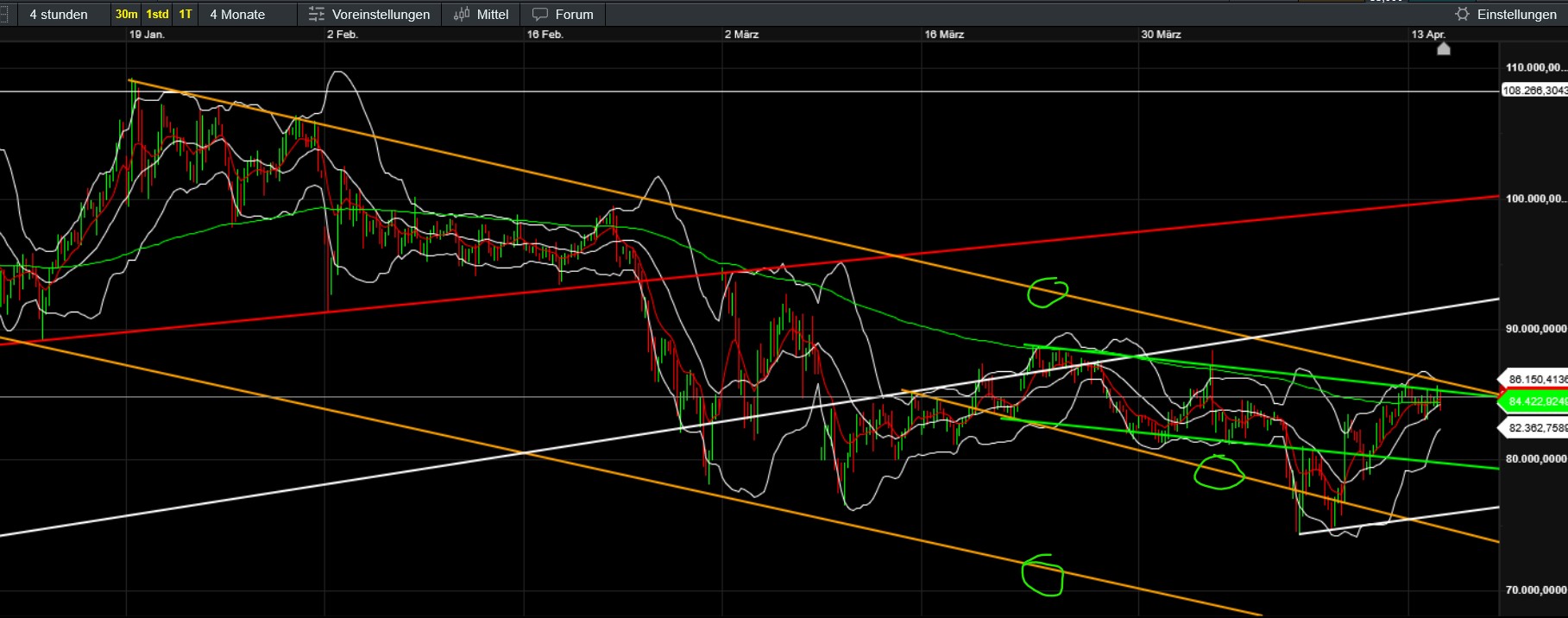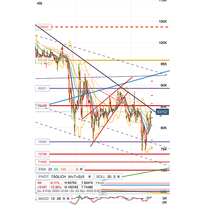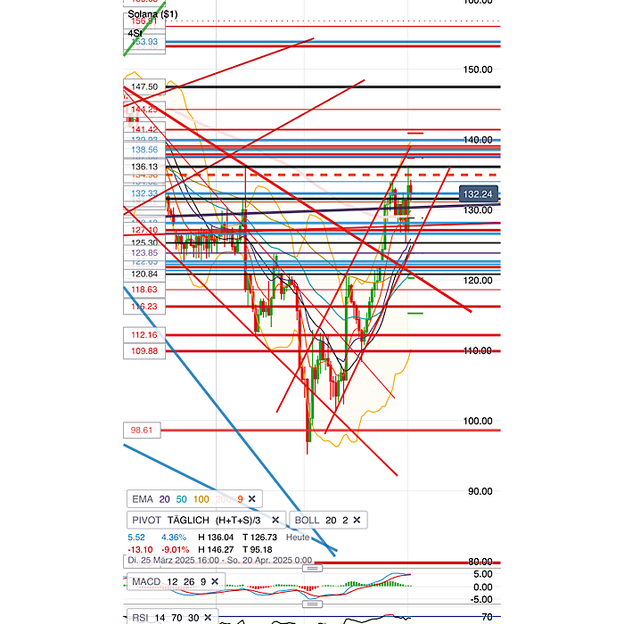 EMA200/4h in meinem Chart mittlerweile geknackt. Allerdings ziehen BTC und die anderen Coins aus meinem Portfolio (Ether, Polygon) nicht mit. Spricht mE zwar erfreulicherweise für die relative Stärke und das Potential von Solana. Ich denke aber nicht, dass es jetzt direkt weiter hoch geht (Flaggenziel rund 150). Könnte eher entsprechend pot. Doppeltop (Hochs bei 136) erstmal etwas korrigieren (obwohl unten nun durchaus schon etwas gestützt), bis der Bitcoin es über die Abwärtstrendlinie bei aktuell rund 85000 schafft oder es fundamental was zu Feiern gibt. Meine Position ist aktuell genau 20 Prozent im Minus, was mir mittelfristig keine Sorgen bereitet.