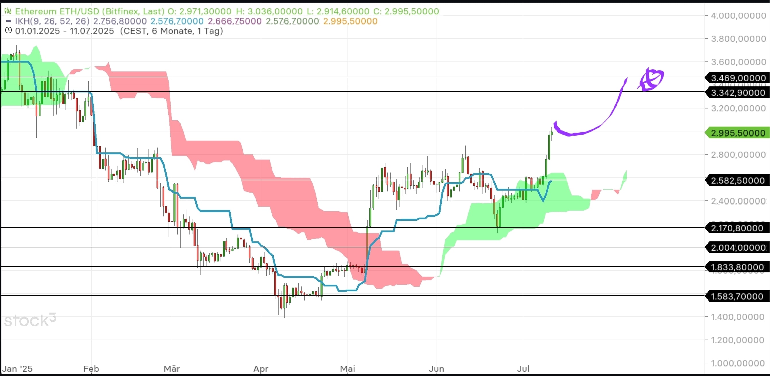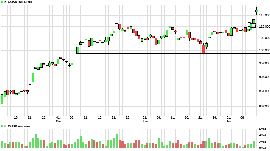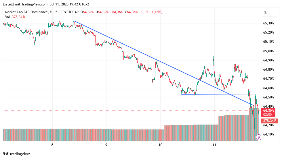 Gibt eigentlich nichts zu Mikes Feststellung zu ergänzen. Außer vielleicht, dass im aktuellen Bereich auch die im 4h ersichtliche Flaggenoberkante liegt. Die Konso innerhalb des pot. Dreiecks (klein grün) läuft wohl schon. Wäre ja auch ein Wunder wenn der Kurs endlich mal richtig Flagge zeigt…Lt. Meinem Chart sollte 107500 halten bzw müssten oben 109200 bzw. 109700 geknackt werden. BTCD echt spannend, könnte tatsächlich mal ein wenig runter rutschen. Klammert sich aber noch an den hor. Unterstützungen fest. Mal sehen irgendwann muss es ja. Die Coins mE allesamt irgendwie in Stellung für pot. Anstiege aber dennoch noch neutral, da einfach der Zünder für einen nennenswerten Anstieg (Ausbruch) fehlt.