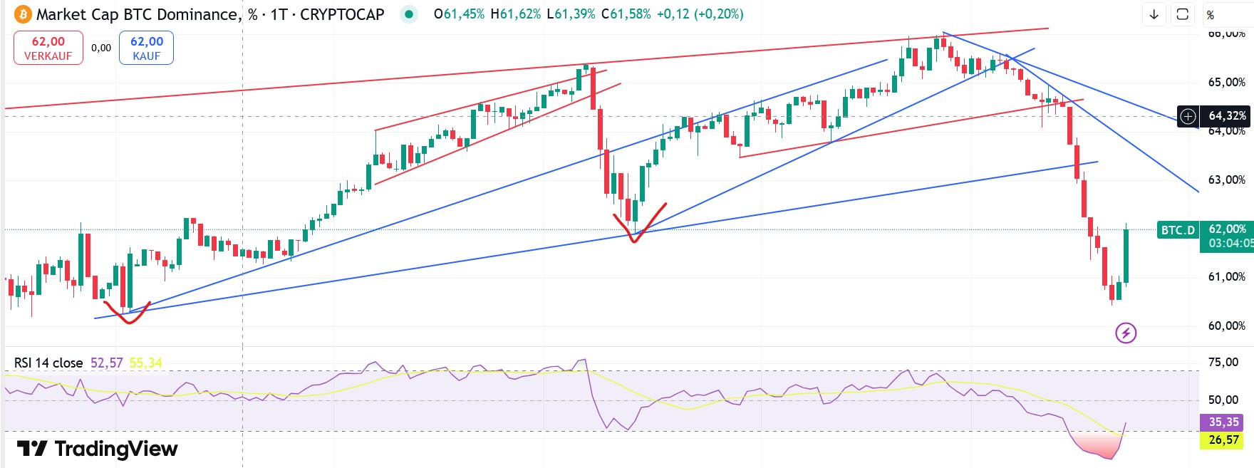 wichtig ist aber dass sie innegehalten haben - die alts zogen versetzt nach wie angenommen - höhe wurde gewonnen - das ist in dieser phase alles was wichtig ist - UM geschützt zu sein - denn aufgrund einiger projekte die in den nächsten wochen noch kommen - vorneweg trumps selbstbedienungsladen - könnte ein teil der zurückflutenden liquidität abgezogen werden - da ist es wichtrig dass wir wie solana markante bereiche gebrochen haben - denn wird dies ähnlich wie bei den verkauften 80kbtc einfach aufgesogen und verarbeitet