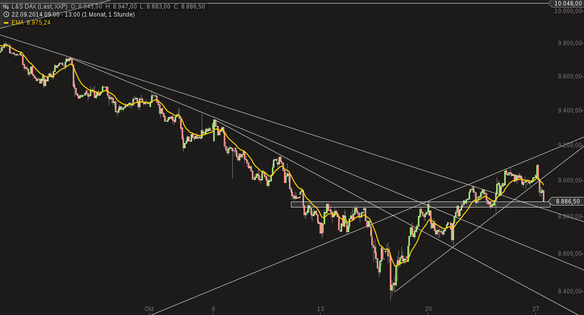 Fakten: Wir haben einen Outside Day, das heißt wieder einmal, dass der erste Ausbruch mit Vorsicht zu genießen ist. Der Outside Day am Donnerstag hat dies deutlich gezeigt, da wir Freitag einen Inside Day hatten und heute große Kursbewegung im DAX sahen, Heute morgen Ausbruch oben aber nun Rücklauf bis an die LL, also vorsicht. Theoretisch gilt aber: Short unterhalb des Outside Days von Donnerstag, Long darüber. Dazwischen ist Niemandsland und man kann darauf setzen, dass er noch nicht ausbricht und dort long/short gehen.