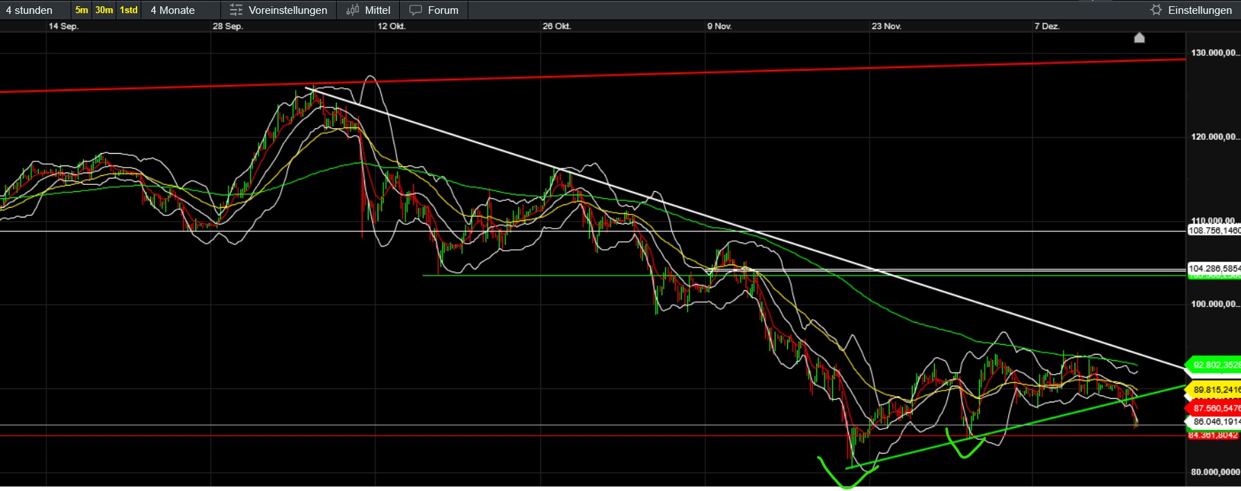 Die nächste Entäuschung. Wie seit Wochen mini Korrektur bis zum ersten Widerstand (Flaggenunterkante, Trendlinie) und dann gleich wieder abgeprallt. Wohl wieder ein üblicher Retest um die Indikatoren abzukühlen, mehr nicht. Bin gespannt, was auf die vermutliche Zinserhöhung in Japan folgt. Eigentlich sollte das diesmal großteils eingepreist sein. Geht es aber doch tatsächlich die üblichen 20 Prozent runter, hätten wir unsere Ziele aus der bärischen Flagge (je nach Bemessung 70-75) jedenfalls abgearbeitet. Allerdings sicher auch die 80500 gebrochen und ein tieferes Tief…. Unabhängig davon, ob wir jetzt runter knallen und dann korrigieren oder zuerst doch noch eine stärkere Gegenbewegung nach oben sehen, an mehr als 99000, ev 107000 glaube ich in absehbarer Zukunft nicht mehr. Dafür fehlt es Momentan einfach an allem. Kann sich natürlich rasch ändern, dass haben wir aber schon oft gehofft. Und machen sich NASDAQ und Co nach ihren letztlichen ATHs auf den Weg nach unten - dann gute Nacht. Ich werde das heute genau beobachten und vielleicht einen Teil (auf Einkaufspreis oder knapp darunter) rausnehmen, einfach auch um Risiko rauszunehmen und unten ggf. Kapital zu haben. Die Altcoins die massiv unter Wasser stehen bleiben.