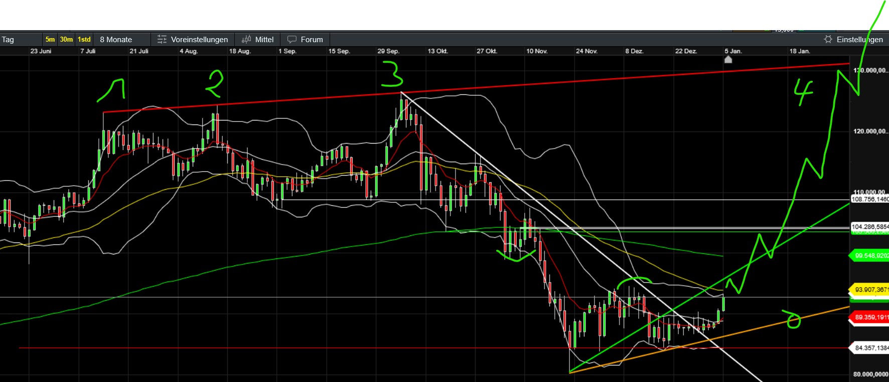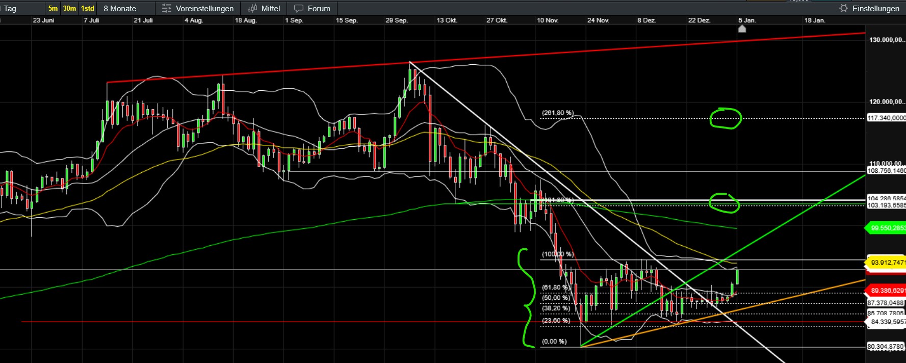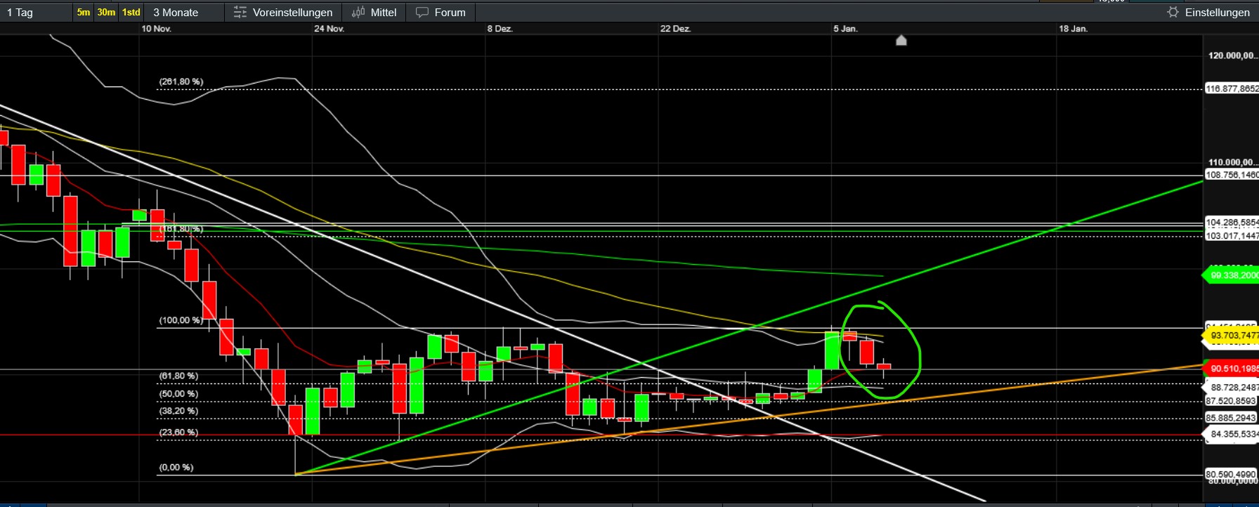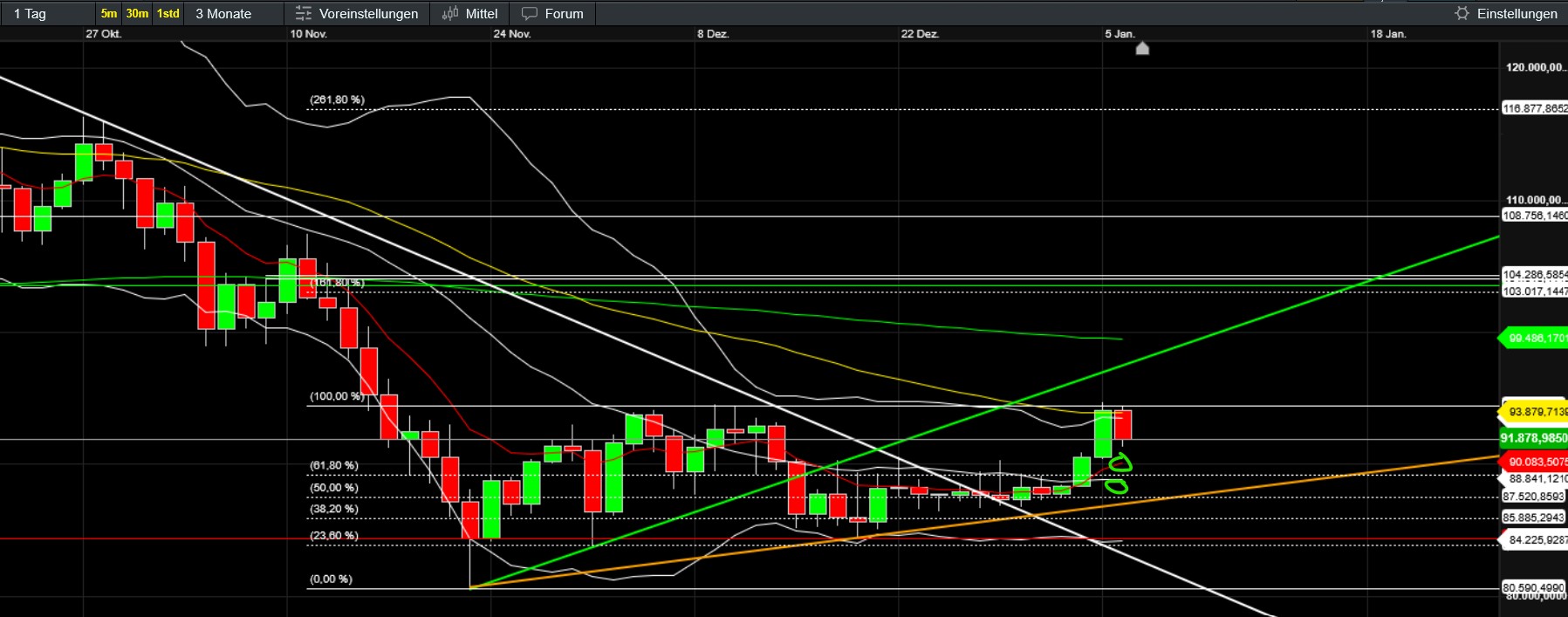 …hoffentlich ändert sich das bald ;-). Unspannend ist es dabei derzeit ja nicht gerade. Gilt natürlich für viele Assets und natürlich auch für BTC und Gefolge. Was bisher (seit Trumps Aktion) auffällt ist, dass der Bitcoin in den kleinen ZE ein höheres Hoch gemacht hat und sich Stand jetzt genau knapp unter EMA50 (das er schon kurz überboten hat) festsetzt. Gleichzeitig wechselt das Sentiment in den neutralen Bereich und die Altcoins (selbst die kleinen) geben Gas und attackieren ebenfalls wichtige Zonen. Fein wäre, wenn nun ein wenig Fomo aufkäme, den gerade jetzt wollen sich wohl viele neu positionieren (Jahreswechsel, Steuer, Gold/Silber sinkt etc). Bleibt abzuwarten, ob die vermutlichen aktuellen Annahmen (Russland und China geschwächt, US profitiert vom Öl Venezuelas und der vermeintlich sinkende Ölpreis senkt die Inflation und erhöht somit die Chance auf eine baldige Zinssenkung…) auch am Montag während der US-Eröffnung noch Bestand haben. Mal sehen wie China und Russland agieren und ob Venezuela sich doch noch zur Wehr setzt.