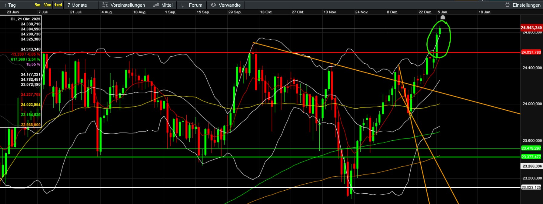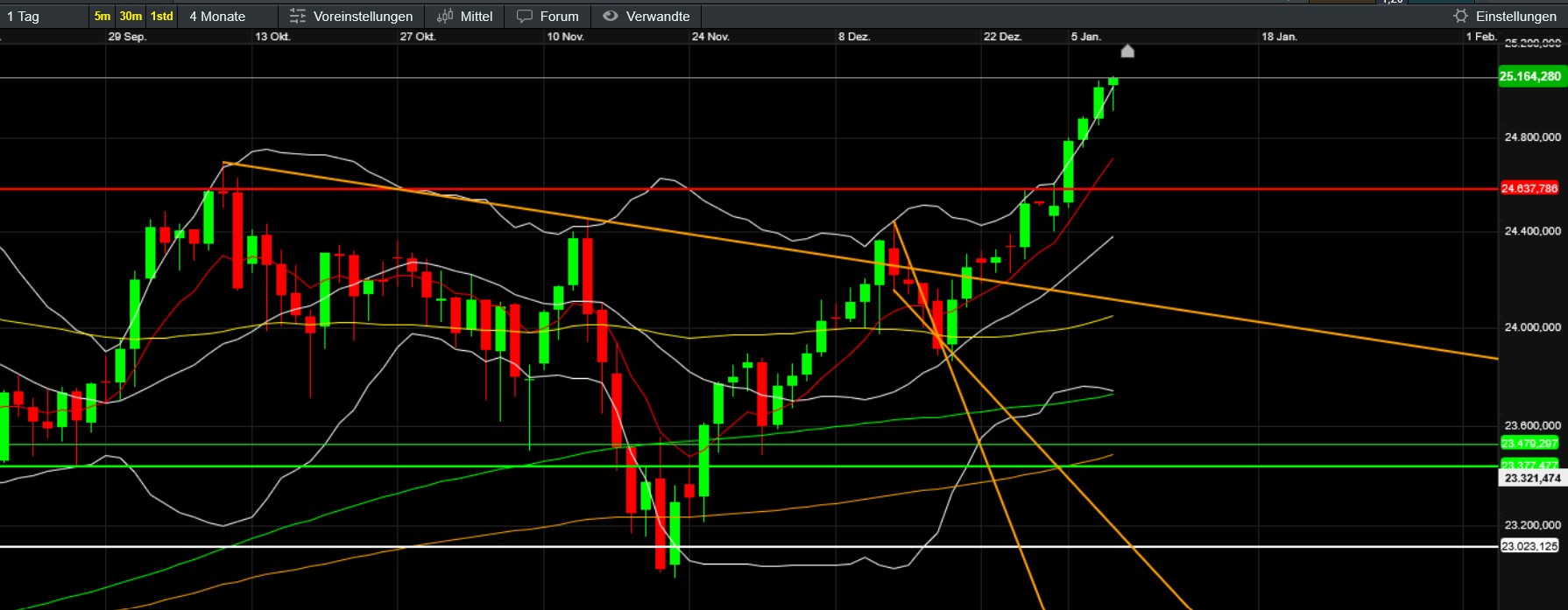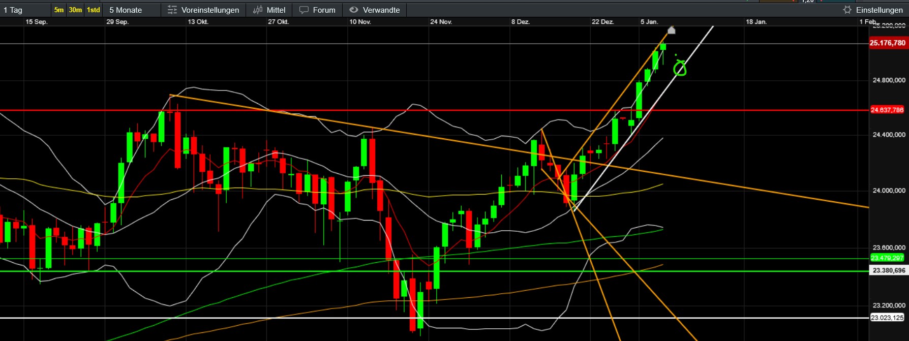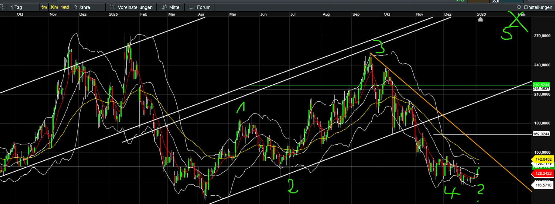 …hoffentlich ändert sich das bald ;-). Unspannend ist es dabei derzeit ja nicht gerade. Gilt natürlich für viele Assets und natürlich auch für BTC und Gefolge. Was bisher (seit Trumps Aktion) auffällt ist, dass der Bitcoin in den kleinen ZE ein höheres Hoch gemacht hat und sich Stand jetzt genau knapp unter EMA50 (das er schon kurz überboten hat) festsetzt. Gleichzeitig wechselt das Sentiment in den neutralen Bereich und die Altcoins (selbst die kleinen) geben Gas und attackieren ebenfalls wichtige Zonen. Fein wäre, wenn nun ein wenig Fomo aufkäme, den gerade jetzt wollen sich wohl viele neu positionieren (Jahreswechsel, Steuer, Gold/Silber sinkt etc). Bleibt abzuwarten, ob die vermutlichen aktuellen Annahmen (Russland und China geschwächt, US profitiert vom Öl Venezuelas und der vermeintlich sinkende Ölpreis senkt die Inflation und erhöht somit die Chance auf eine baldige Zinssenkung…) auch am Montag während der US-Eröffnung noch Bestand haben. Mal sehen wie China und Russland agieren und ob Venezuela sich doch noch zur Wehr setzt.